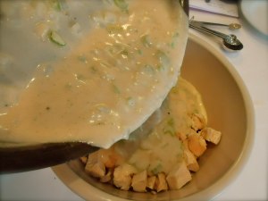Pour the cooled sauce into the chicken/carrot/potato mixture.
