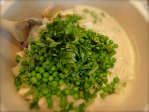 Add in the last seasonings and the peas and parsley. Be sure to taste it now. If it need a little more pepper or salt add at your own discretion.