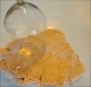 When ready, roll the dough out on a lightly floured surface to a thickness of about 1 inch. Cut with a biscuit cutter (I use a wine glass). You should get about 8-10, three-inch diameter biscuits.