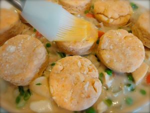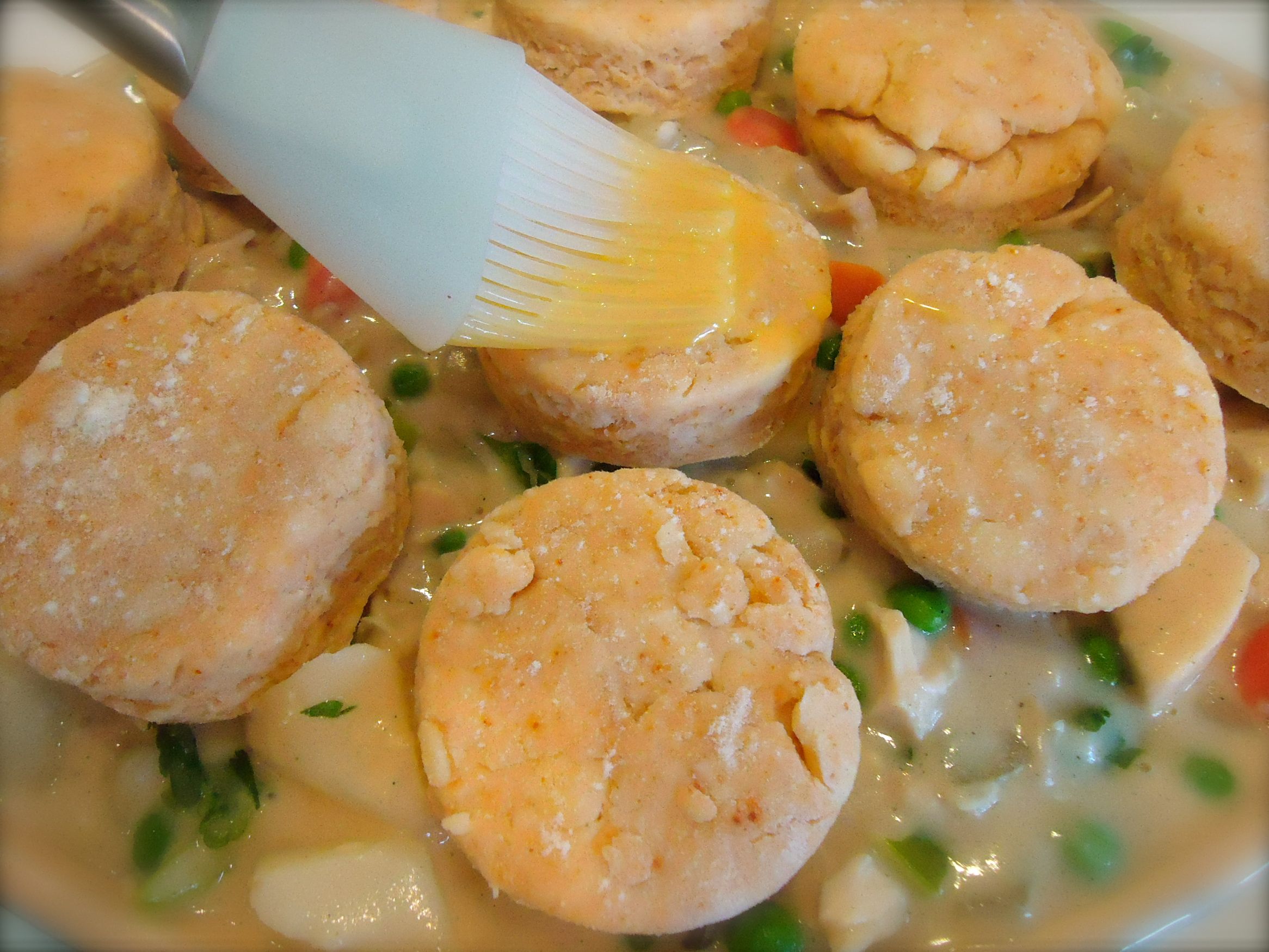 Place paprika cheddar biscuits on top of the chicken filling and brush each biscuit with the egg wash. Bake in preheated 350 degree oven until biscuits are baked and golden brown and the filling is bubbly – about 25-30 minutes.
