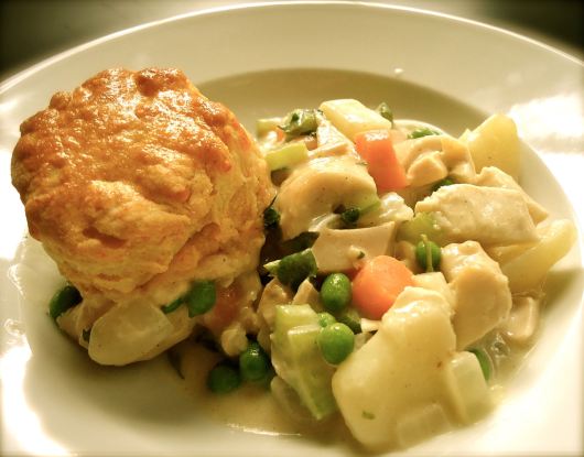 Brush the biscuits with an egg wash and pop the whole pot pie in the preheated oven for about 25-30 minutes. You can also make individual portions in oven-proof ramekins, topping each with it's own biscuit. Adjust the bake time.