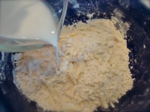 Add the cold buttermilk once you have stirred in the cheese. Tip: Pour in a little, mix it around and keep adding a little at a time and stir a bit more until the mixture just "comes together".