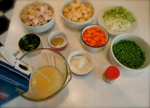 Add the chopped chicken to the potatoes and carrots in a large bowl. Stir in the onion/celery cream mixture and then the peas and parsley. Add in ½ tsp. of salt and ½ tsp of pepper. Mix gently. Taste and adjust the salt and pepper to your taste. Pour filling into an oven proof baking pan. Preheat oven to 350.