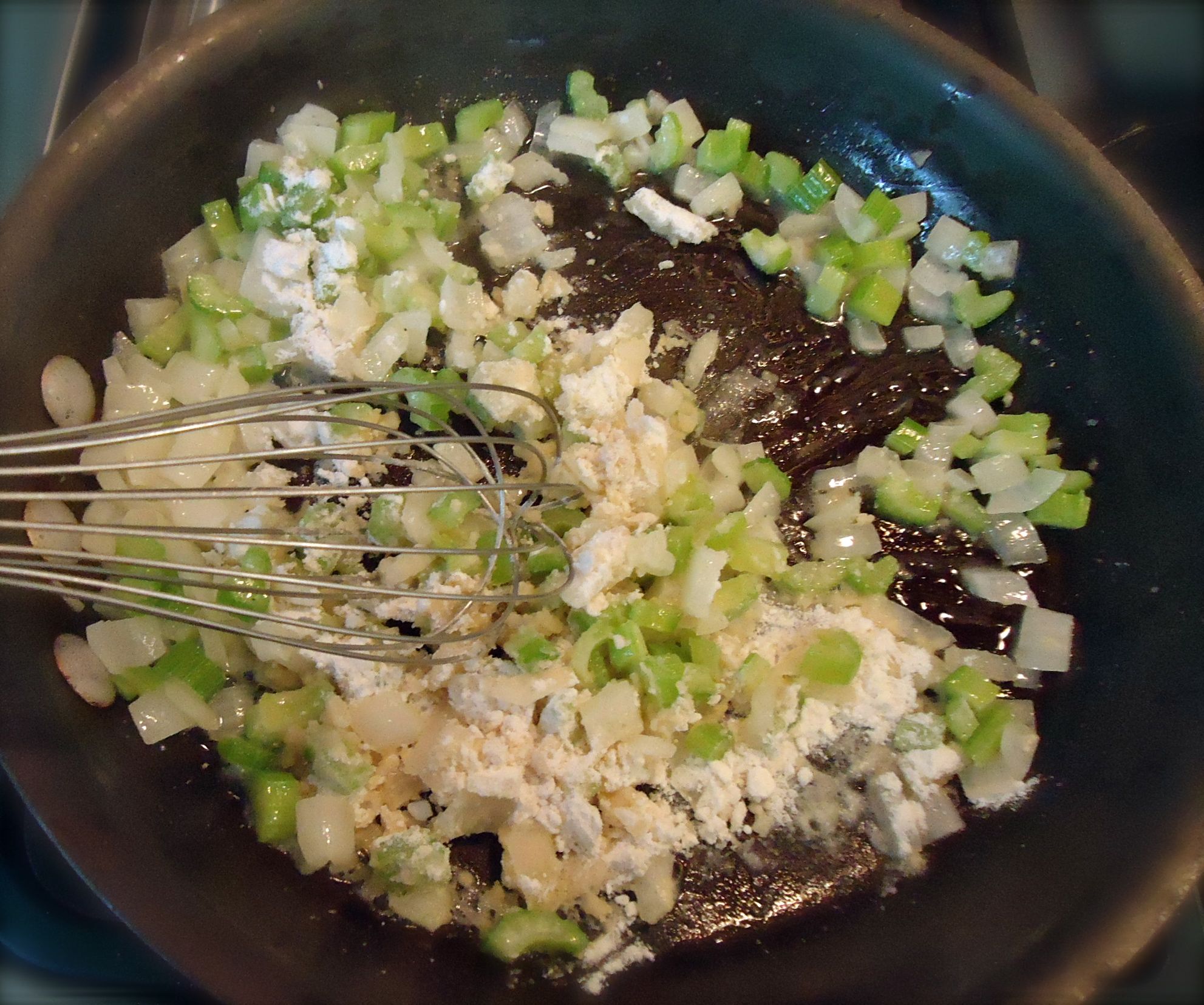 Saute the onions and celery in the butter until just softened and then stir in the flour. Have the leftover stock/broth ready to add...