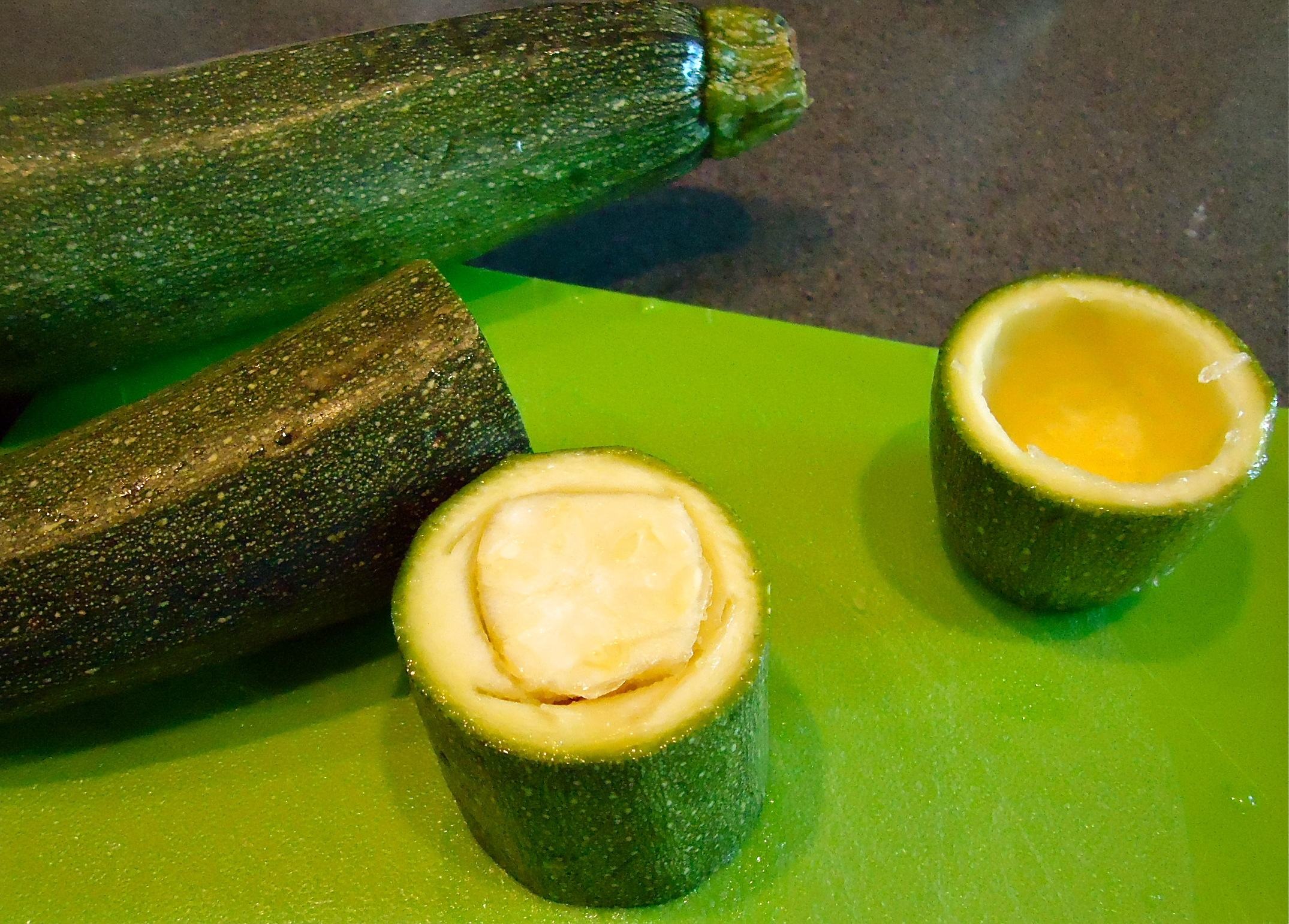 Making "cups" with zucchini is easy. A small spoon will work to scoop out the core as will a melon-ball tool. Try not to break through the bottom of the "cup".