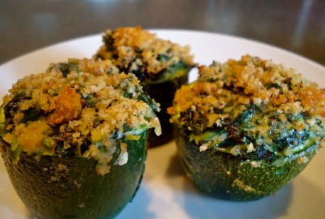 In a medium bowl whisk the eggs, add the ricotta and the Parmesan. Mix in the spinach and the salt, pepper, and nutmeg. Fill each zucchini cup or boat with the spinach mixture. Sprinkle with butter crumbs* (or dip the cups into the crumbs as I did, whatever is easiest).