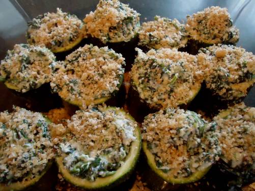 Out of the oven, all cheesy spinachy good with a crunchy top of butter crumb. This recipe makes at least 8 servings of filling, just use more zucchini. Or use your leftover filling to stuff sweet Vidalia onions!