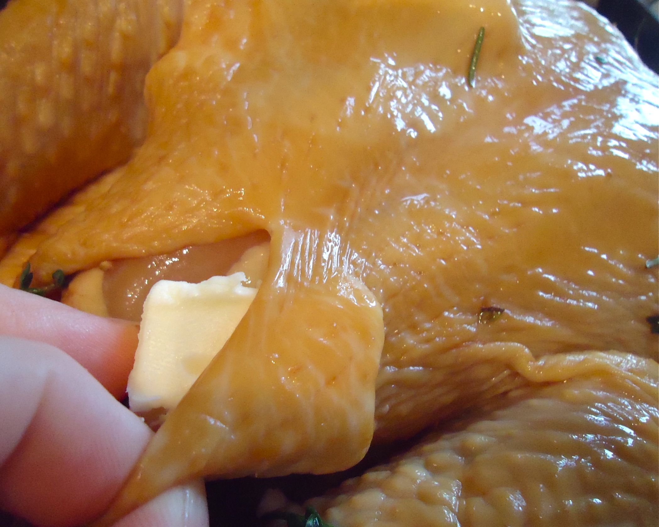 Place a little butter in the pockets between the breast meat and the skin, on both sides and then a couple of bits go inside the cavity. I did not bother to truss this bird but you can, if you like.