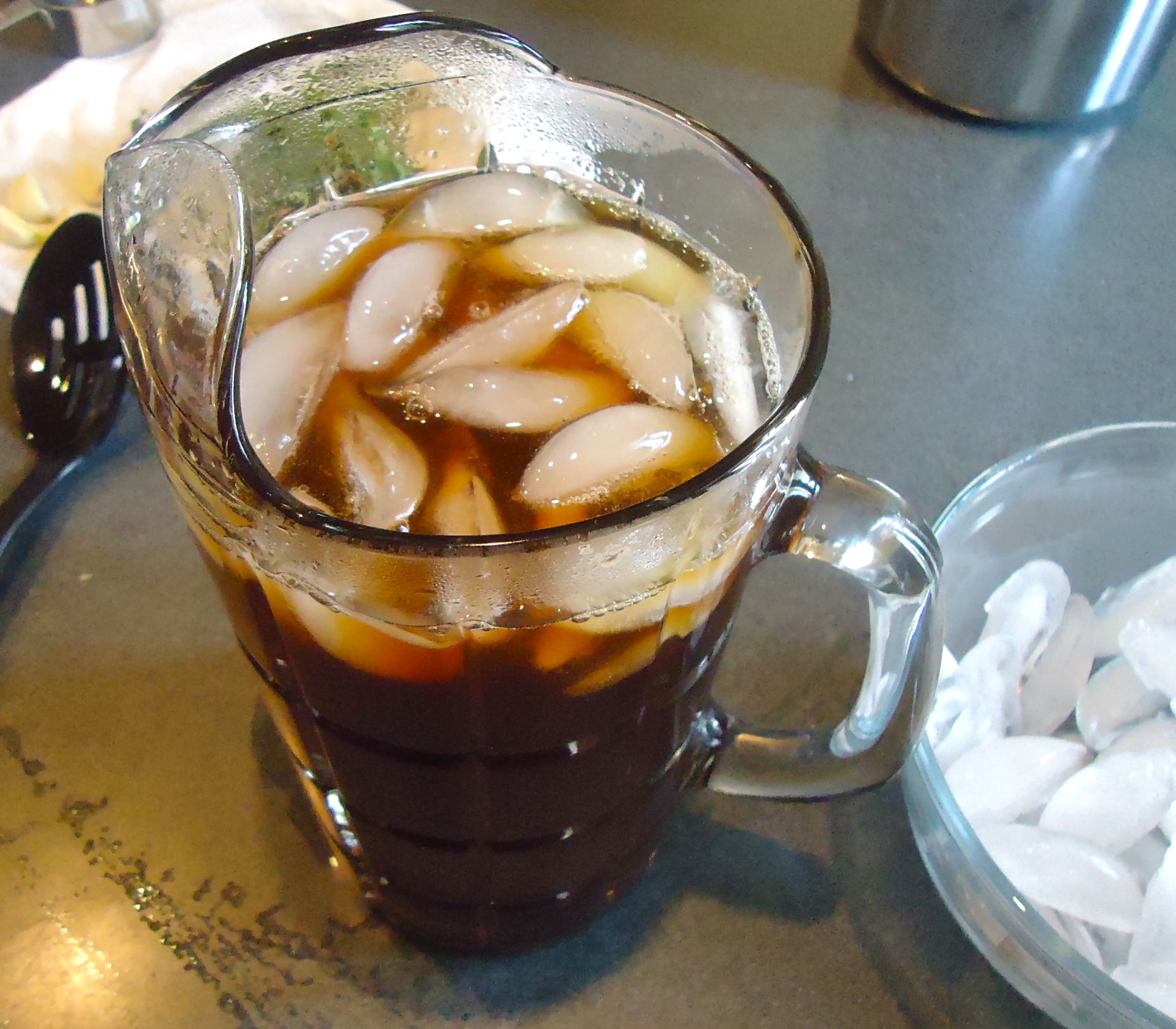 Make the tea: Heat about 4 cups of water in a pot with a lid. Bring to a low boil, add tea bags, and remove from heat and cover. Allow to steep 3 minutes. Remove tea bags, squeezing them gently. Discard the used tea bags. In a large pitcher or bowl add the salt and sugar. Pour tea over this and stir well. Add 2-3 cups of ice and stir. Allow to cool to room temperature and place in the refrigerator to cool.