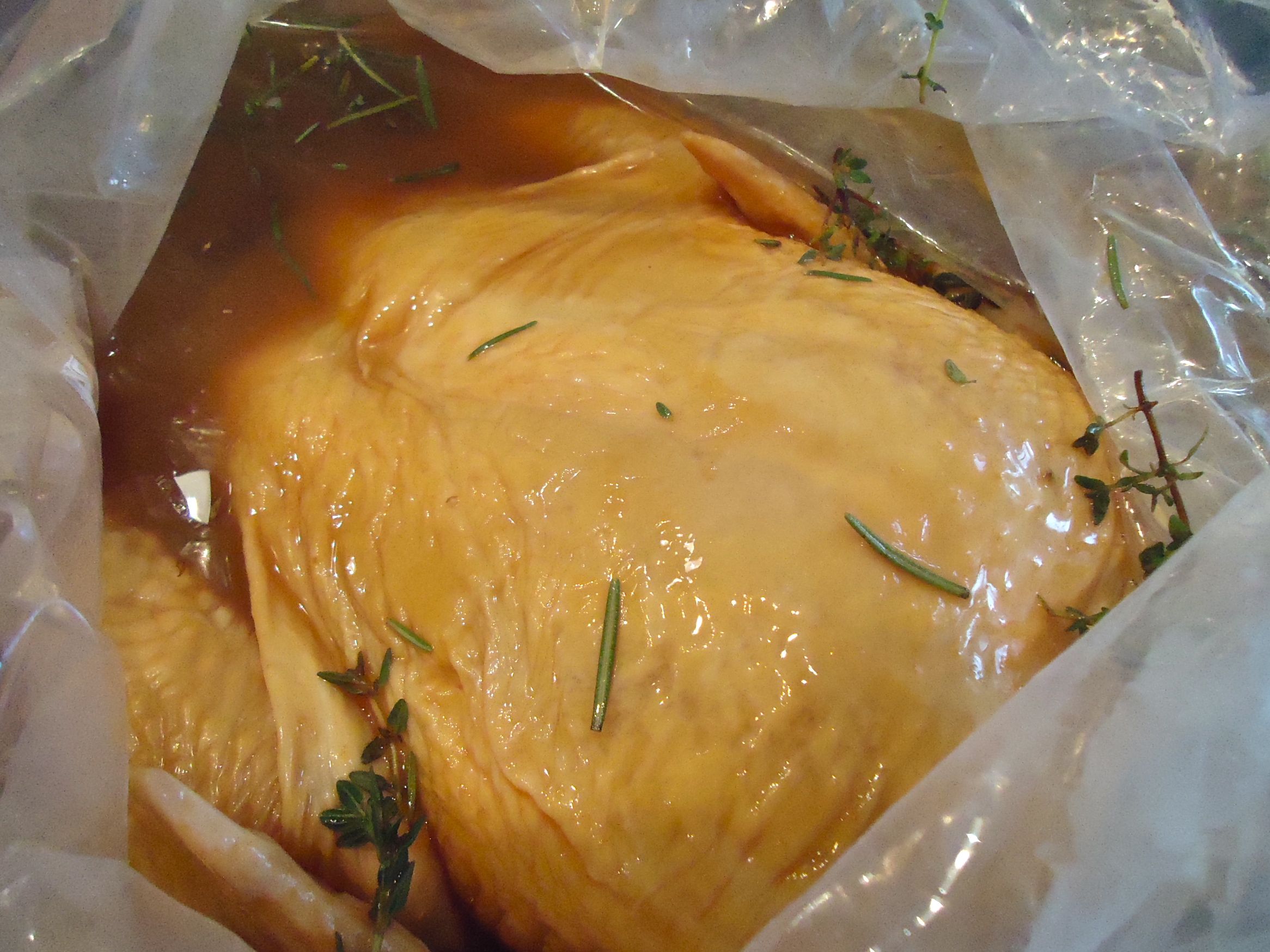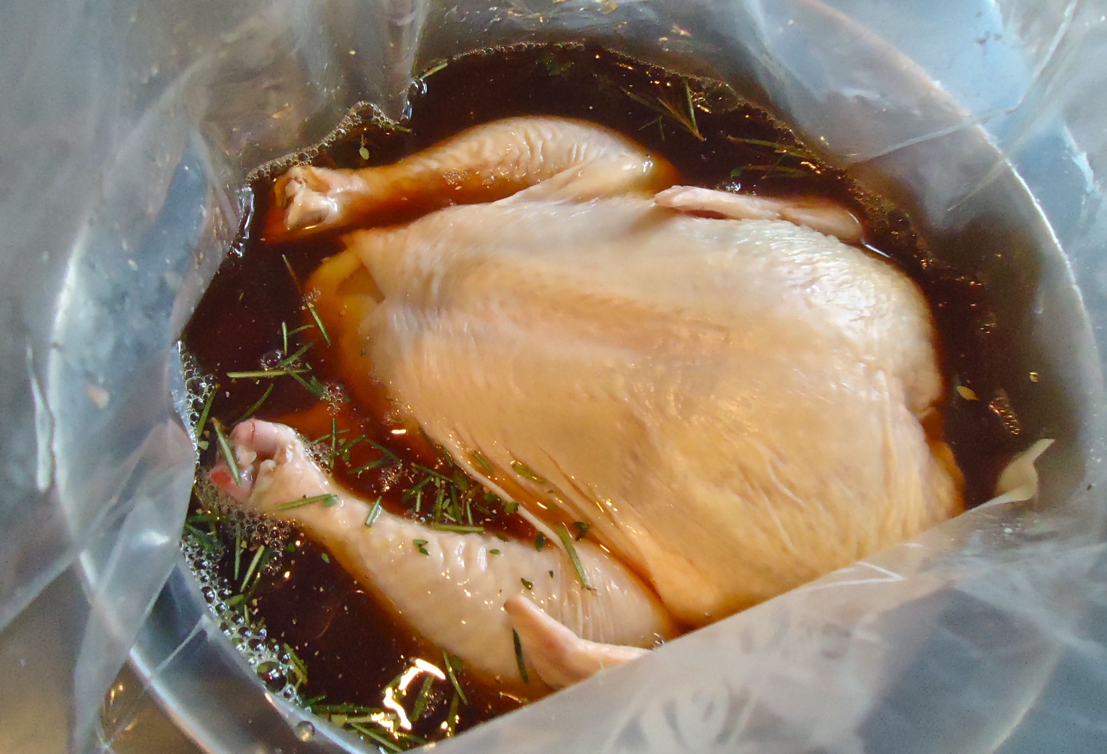 In an extra large plastic bag (that zips securely closed) add the herbs and the garlic and pour in the tea. Then place the chicken in the bag and secure. Place the chicken (you can place the bag in another bowl or pan just in case of leaks) in the refrigerator.