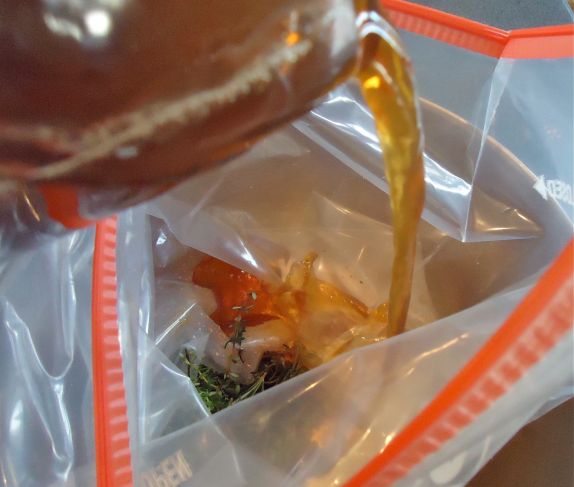 Place the herbs and the garlic in the bag and then add the brine.