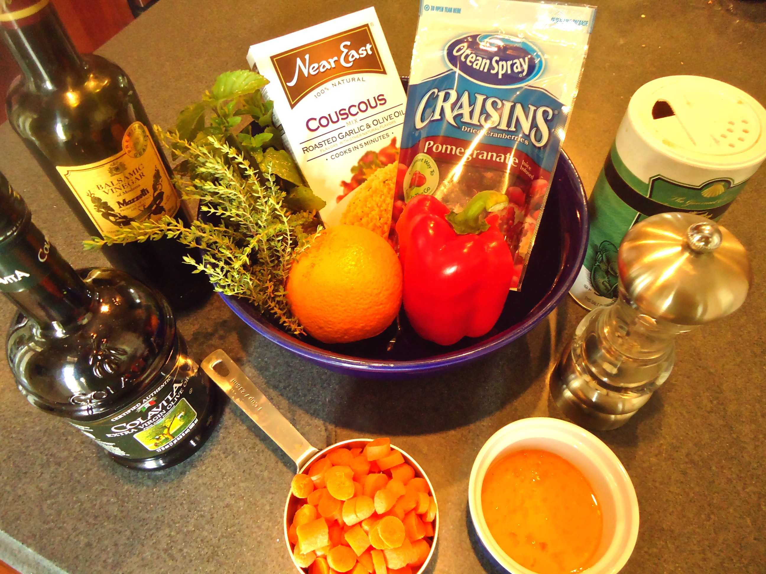 In a large serving bowl mix together the carrots, bell pepper, craisins and the cooled couscous. Mix lightly. Stir in the mint, orange zest and thyme. Pour half the vinaigrette over the mixture and carefully mix together. Add some ground pepper. You may pour in rest of vinaigrette – or not. I find I usually only use a little more half the vinaigrette. Use the leftover vinaigrette as a base for an Italian-style salad dressing or grilling marinade. It will keep in the refrigerator several days.