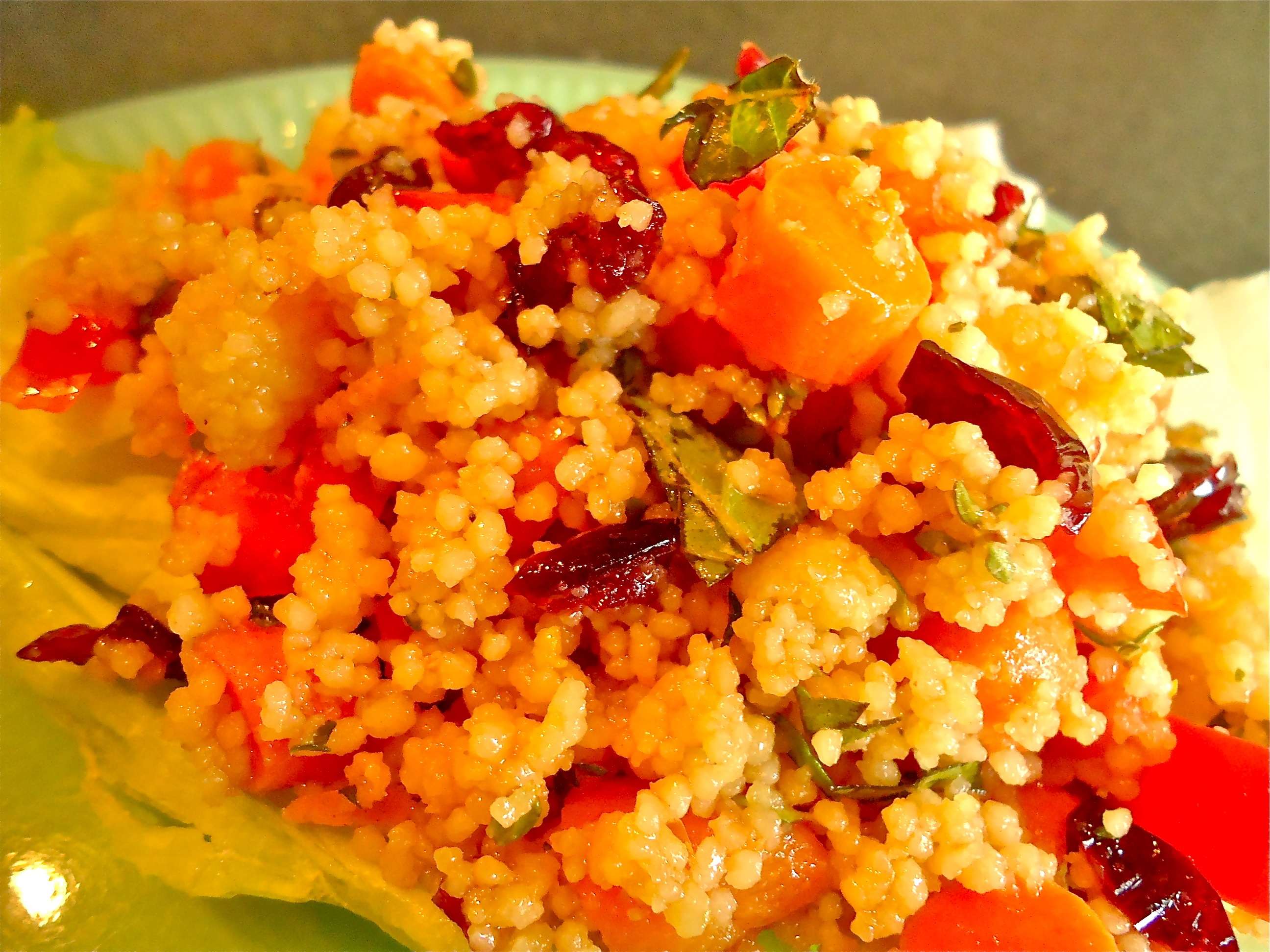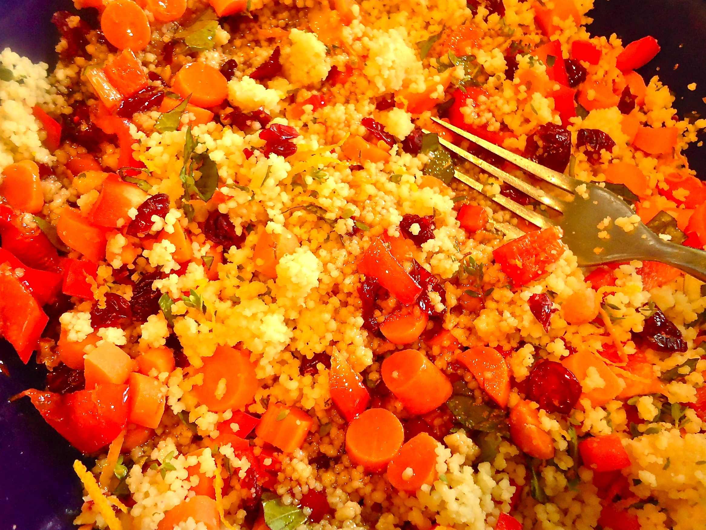 Today I offer up a recipe that is full of surprises. Like the first time you ever tasted salty and sweet together – who would have thought those two seemingly opposite tastes would complement each other so well? Couscous is an old grain, semolina actually, originally first used in North Africa/Andalusian regions and now widely loved from the Middle East to Europe to South America and the U.S. But the couscous is not the stunner really – well, it may be since I write about Southern-style US cooking, so the fact that I use this as a base for my salad may be out of the box. However, my recipe incorporates other ingredients in combination that are more of a revelation than any actual shock.