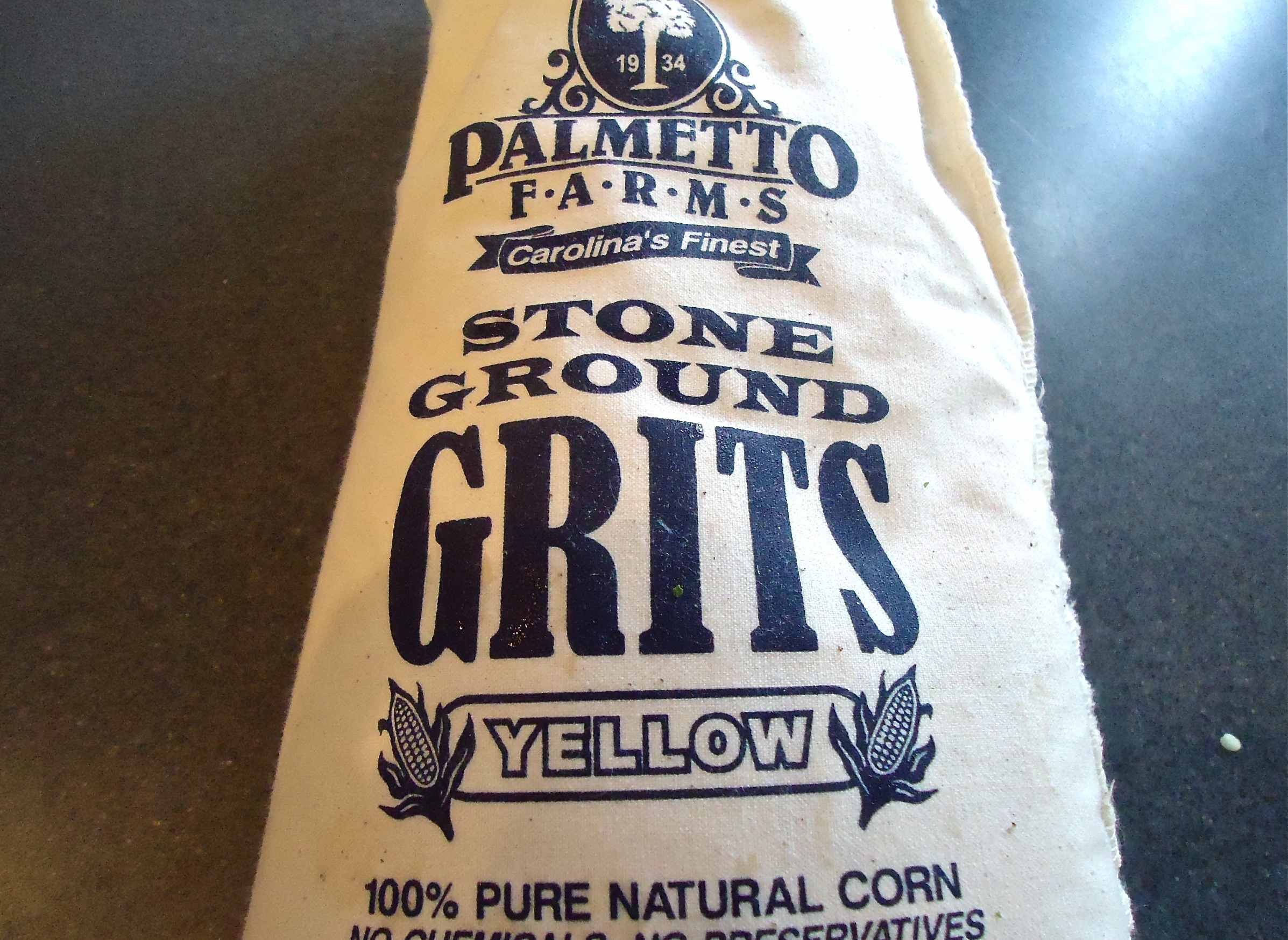 A bag of lovely stone-ground grits from Palmetto Farms. Keep your grits in the freezer, they stay fresher that way!