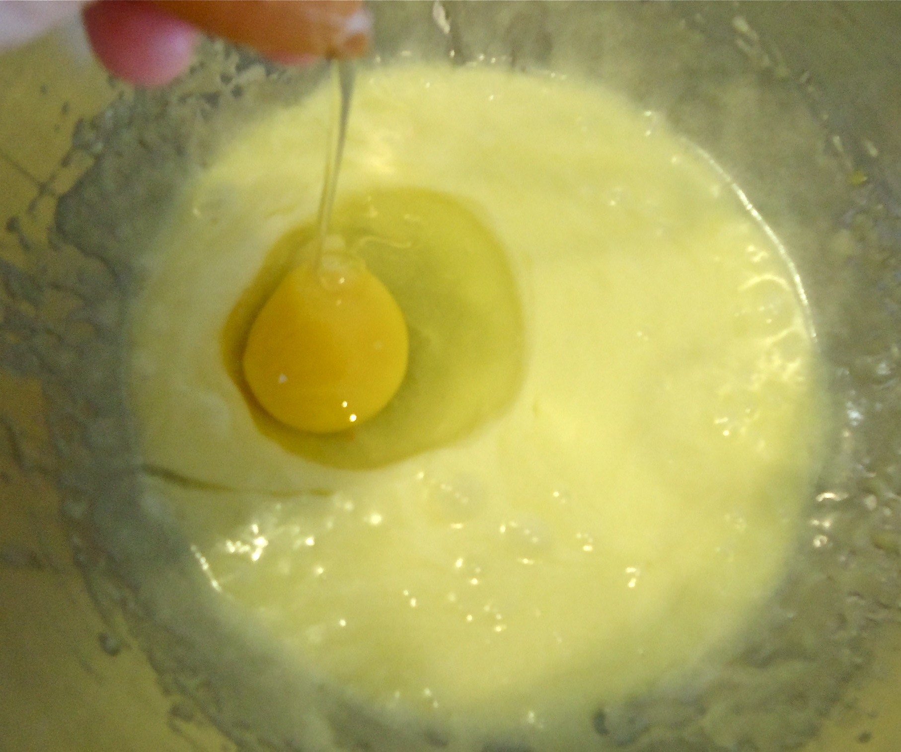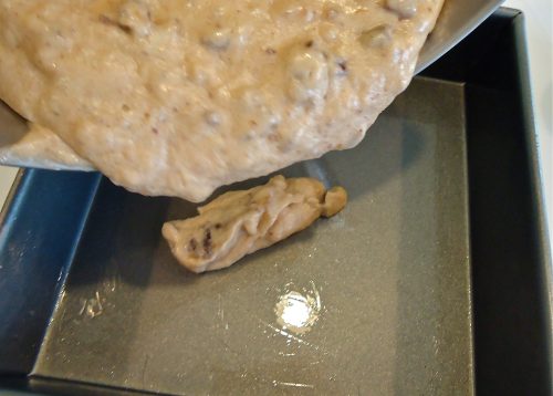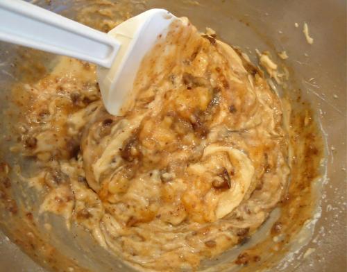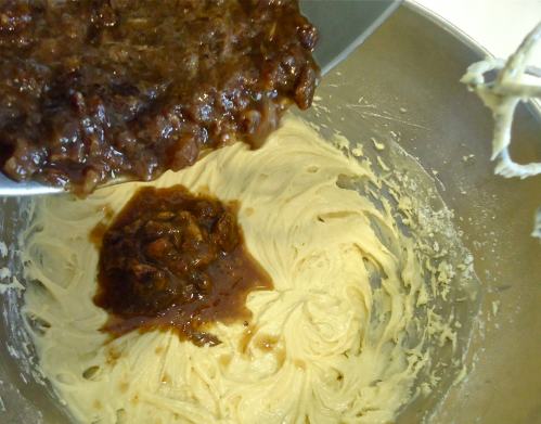 Add the pureed dates to the batter. You can see the consistency is chunky but moist since soaking them in the hot water.
