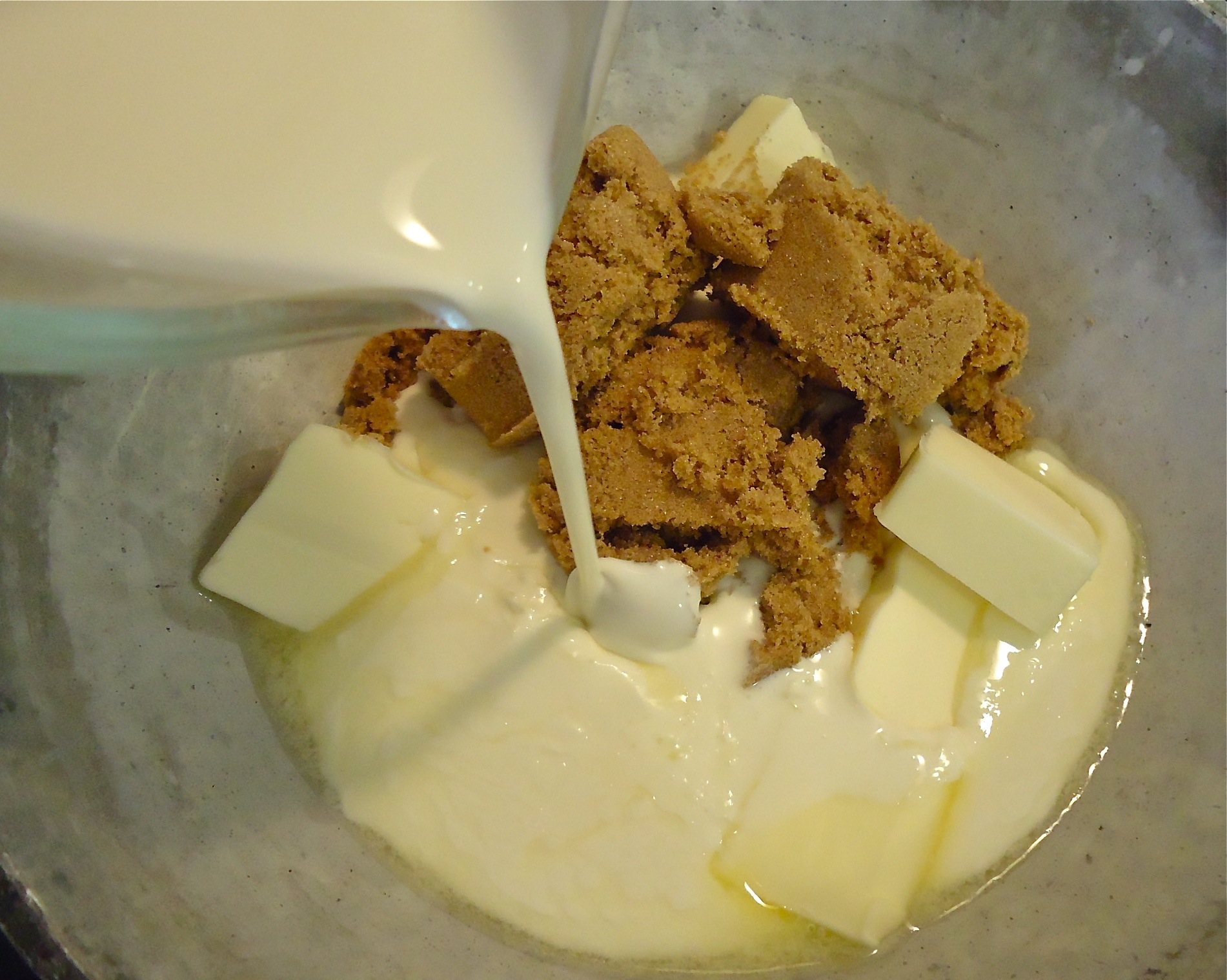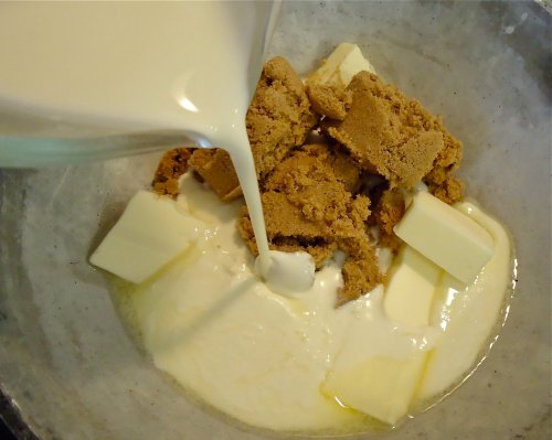 This toffee/caramel sauce is so easy to make. Melt the butter with the brown sugar over low heat. Add the cream.