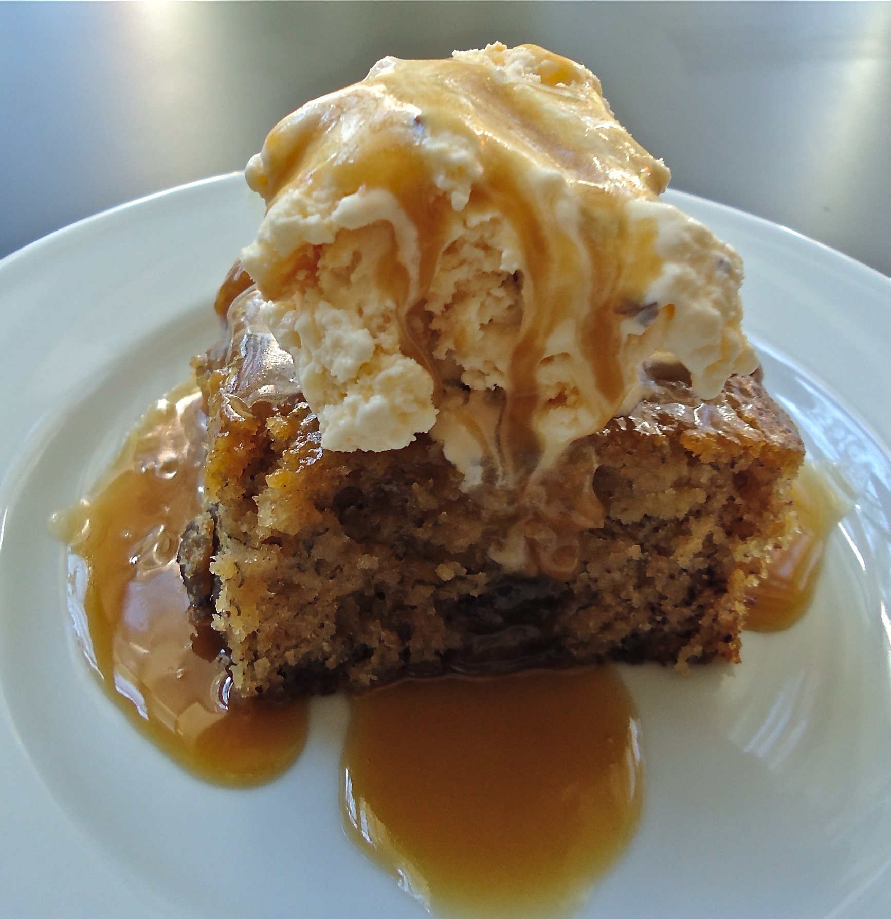 Using a skewer punch holes across and all over the top of the pudding. Pour half of the hot caramel toffee sauce over the pudding so it soaks in for at least 15 minutes. Cut warm pudding into squares, top with a dollop of whipped cream, vanilla ice cream or crème fraiche. Drizzle a spoonful (or two!) of caramel toffee sauce.