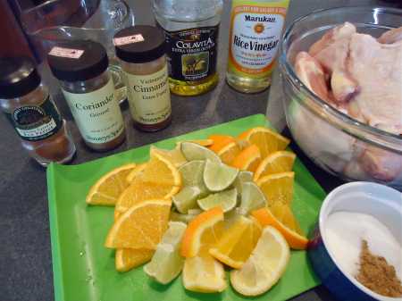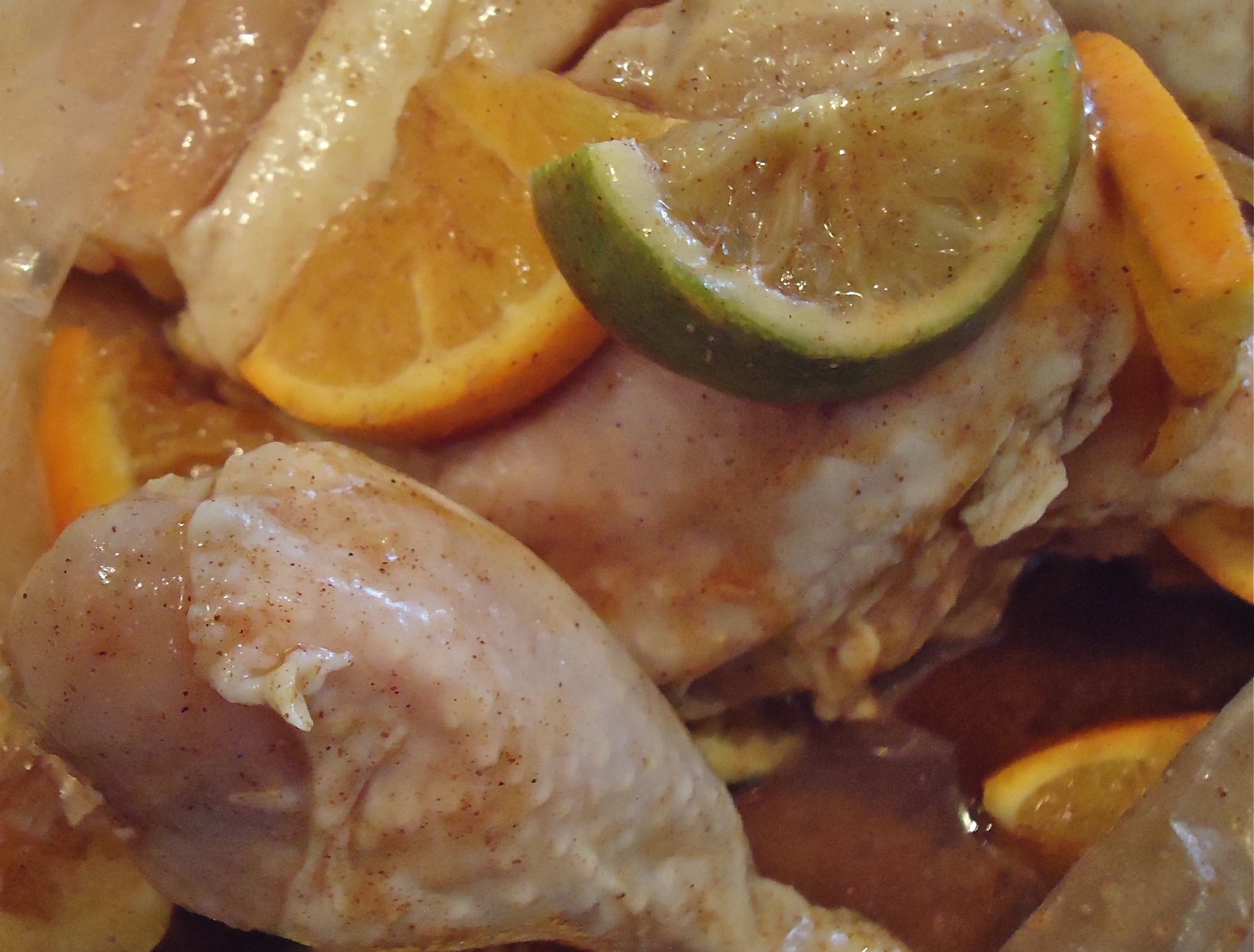 Wash and dry chicken pieces and set aside. In a bowl mix the oils, vinegar, spices and salt. Add in the juice from 1 orange. Add sliced fruits. In a large zippered plastic bag or shallow container add chicken and pour the marinade and fruit over the chicken. Cover or secure the bag and place in the refrigerator to marinate at 8-12 hours. Turn the mixture over a few times throughout the marinating time.