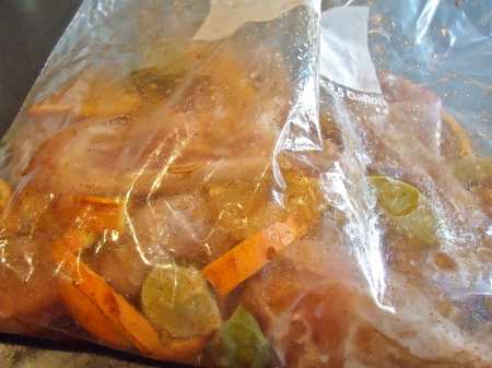 Place the chicken pieces in the bag , add the marinade and the sliced fruit. Make sure the marinade is coating the chicken and place the closed bag ( or covered bowl) in the refrigerator. During the marinade time flip the bag over a time or two.