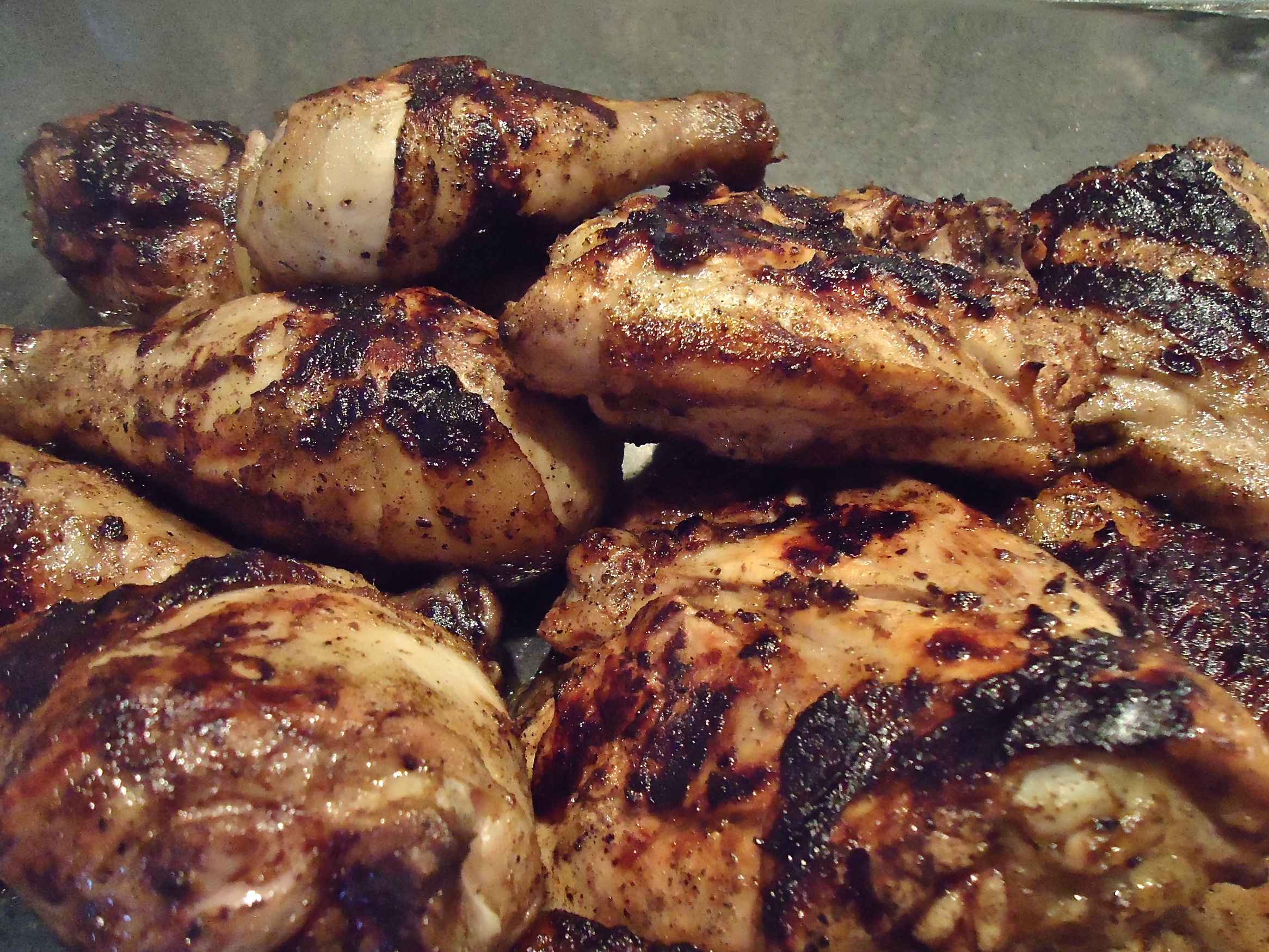 Prepare your grill. When ready, sear chicken pieces on the grill, careful that they do not burn. Since the marinade contains a lot of oil (and if the skin is left on the chicken) it will easily catch on fire. Grill until cooked through. Serve immediately. Serves 6.