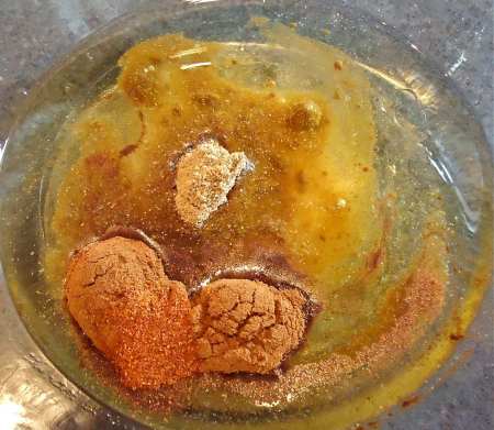 After marinating all day this is how the chicken looks. You can discard the fruit and excess marinade. Get your grill ready!