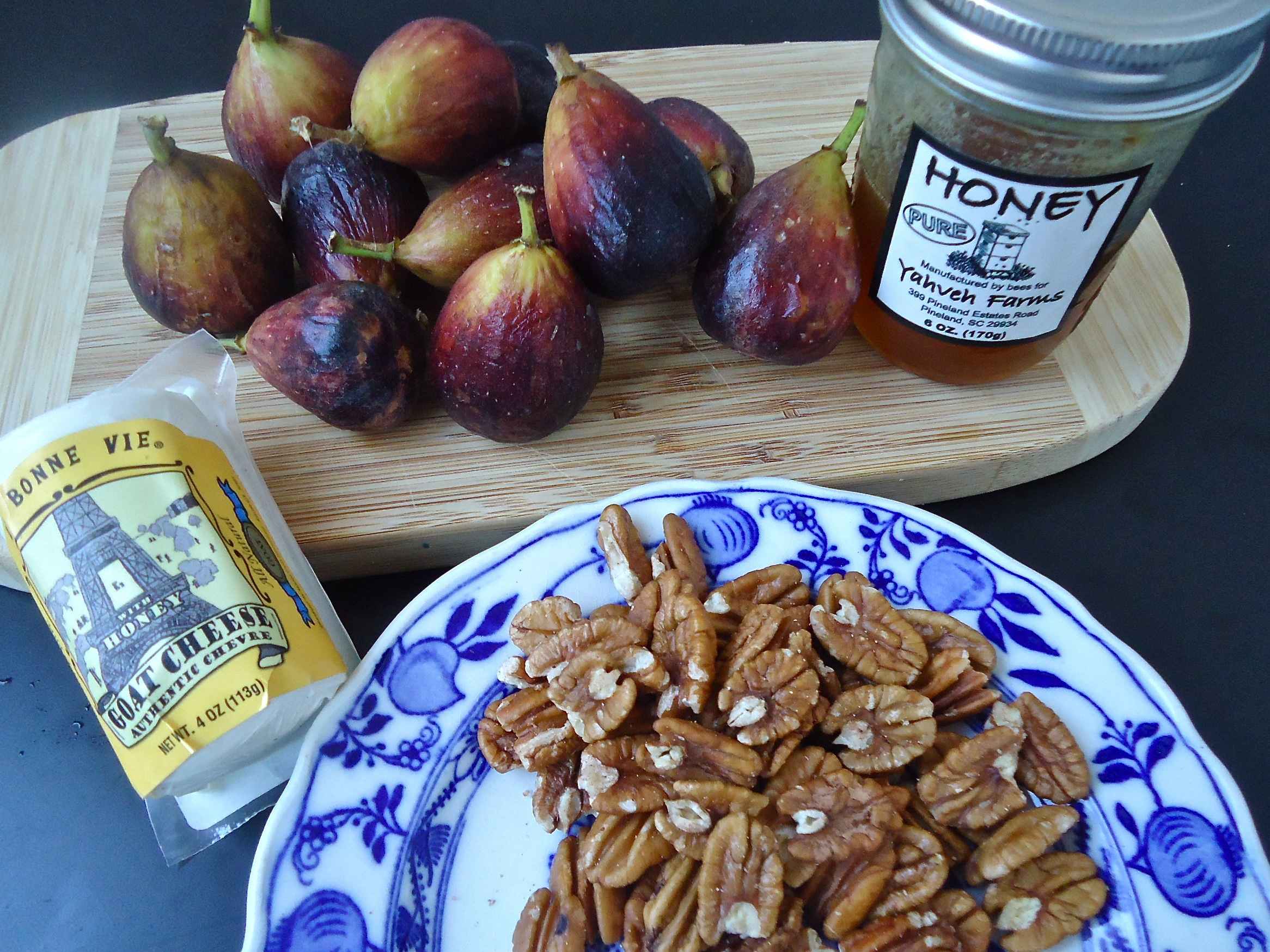 This recipe make both a tasty appetizer or a light dessert. You can use plain goat cheese or a flavored one, like the honey infused variety I used here. I adore pecans and pairing them with figs just seemed the right fit, if you know what I mean. But walnuts are good too. I enjoyed these figs with a Pinot Noir, but I would think that most any light to medium bodied wine (red or white) would pair well with this recipe.