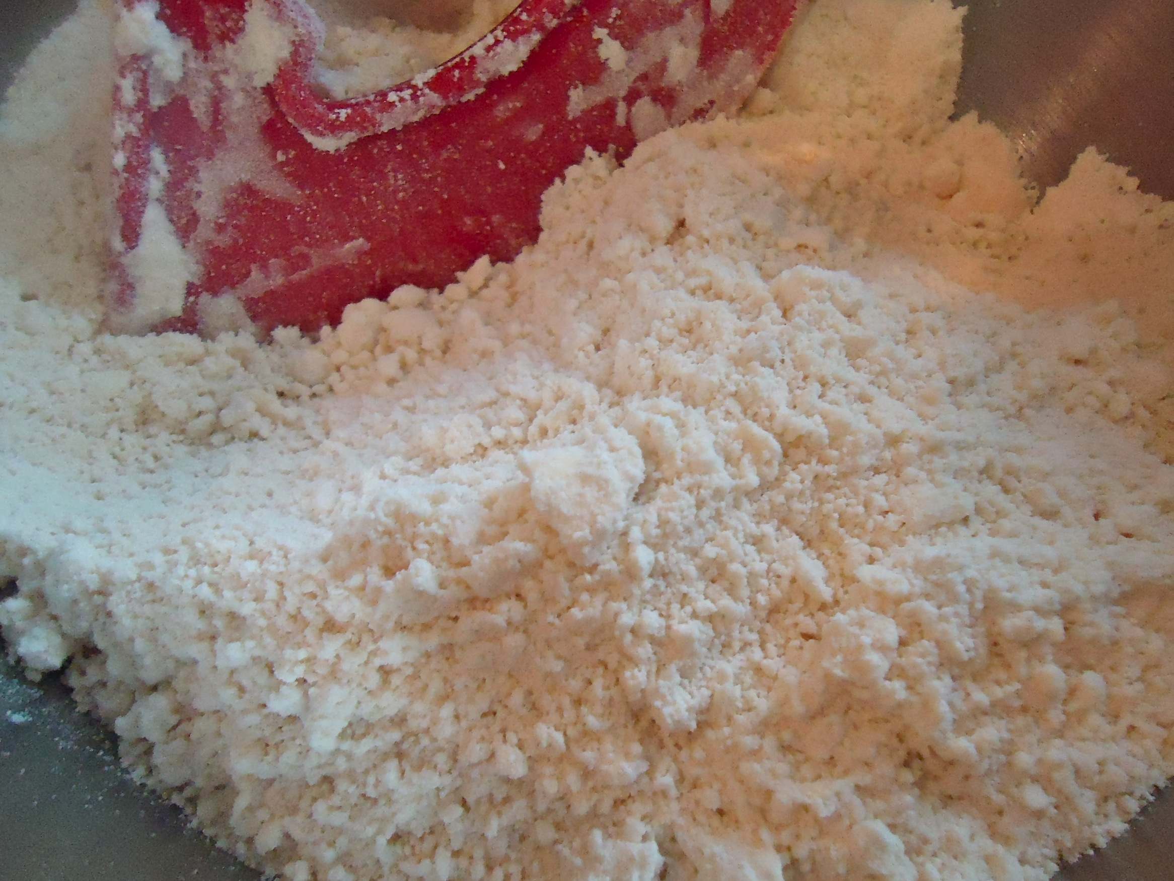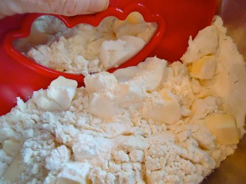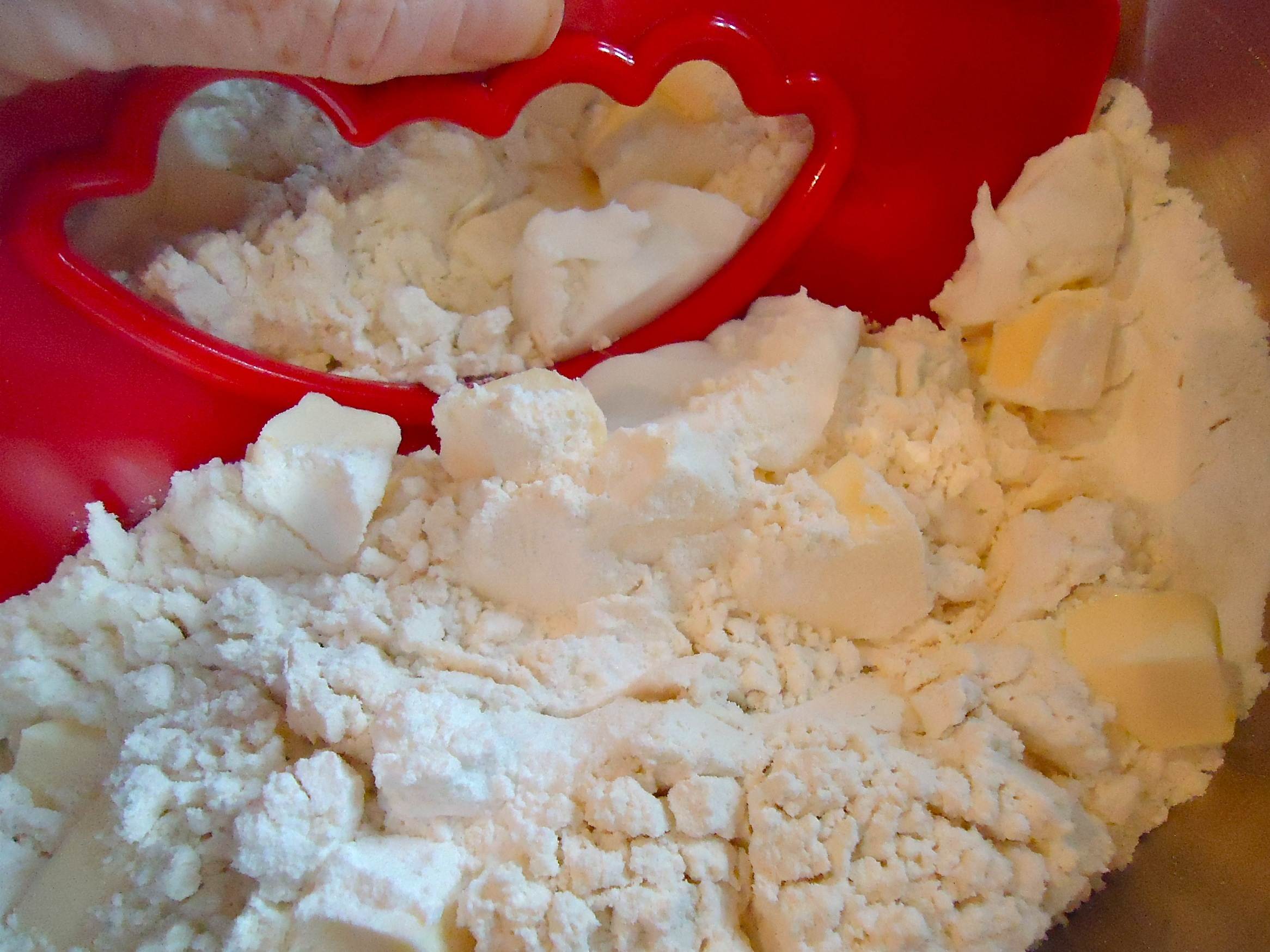 In a very large bowl combine all dry ingredients and cut in the butter and shortening with a pastry blender, fork or your hands (your clean hands). When the mixture resembles cornmeal you’re good. Pour in the buttermilk mixture and stir to combine for a soft dough.