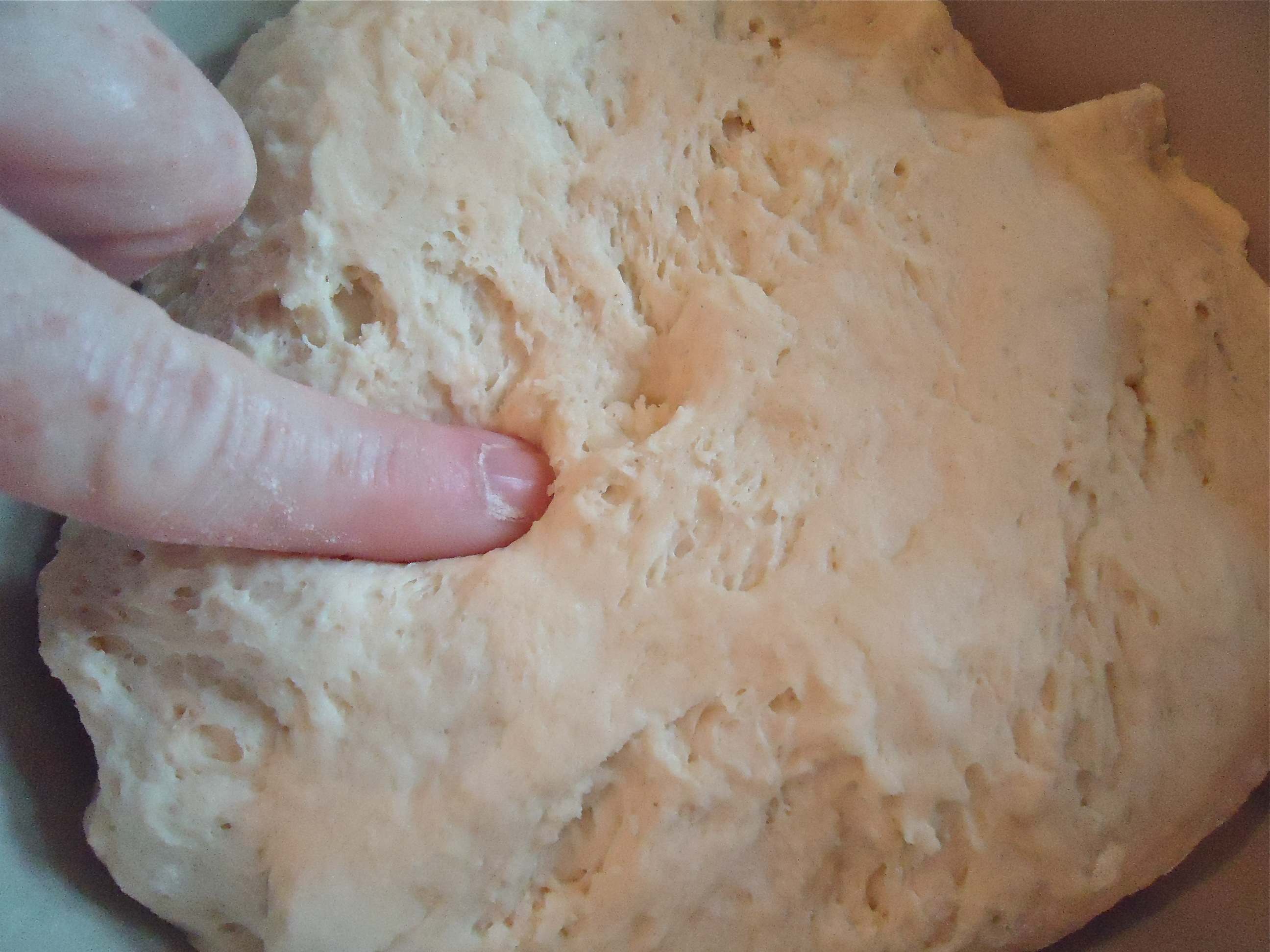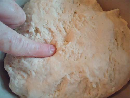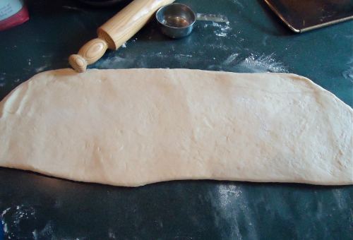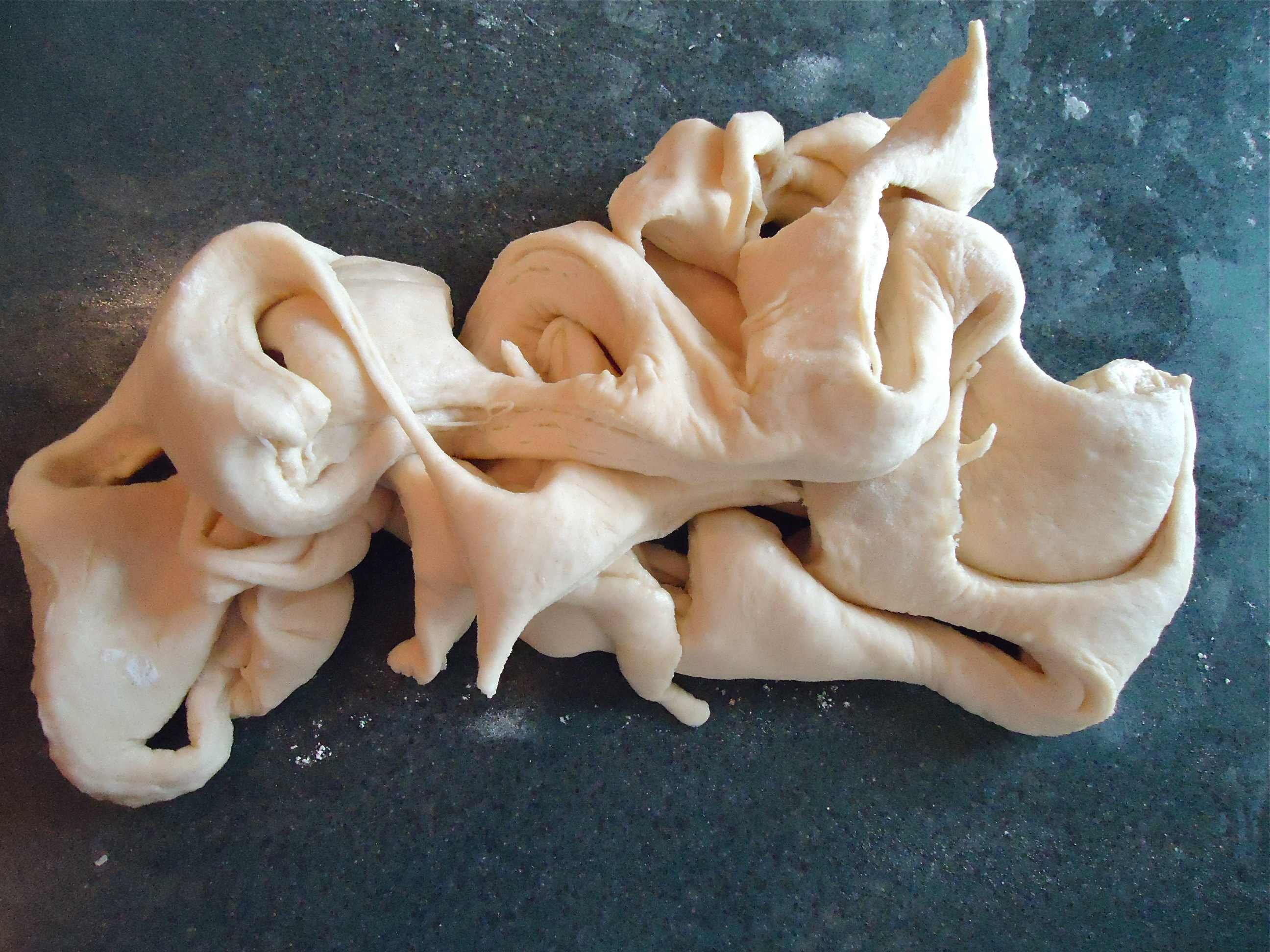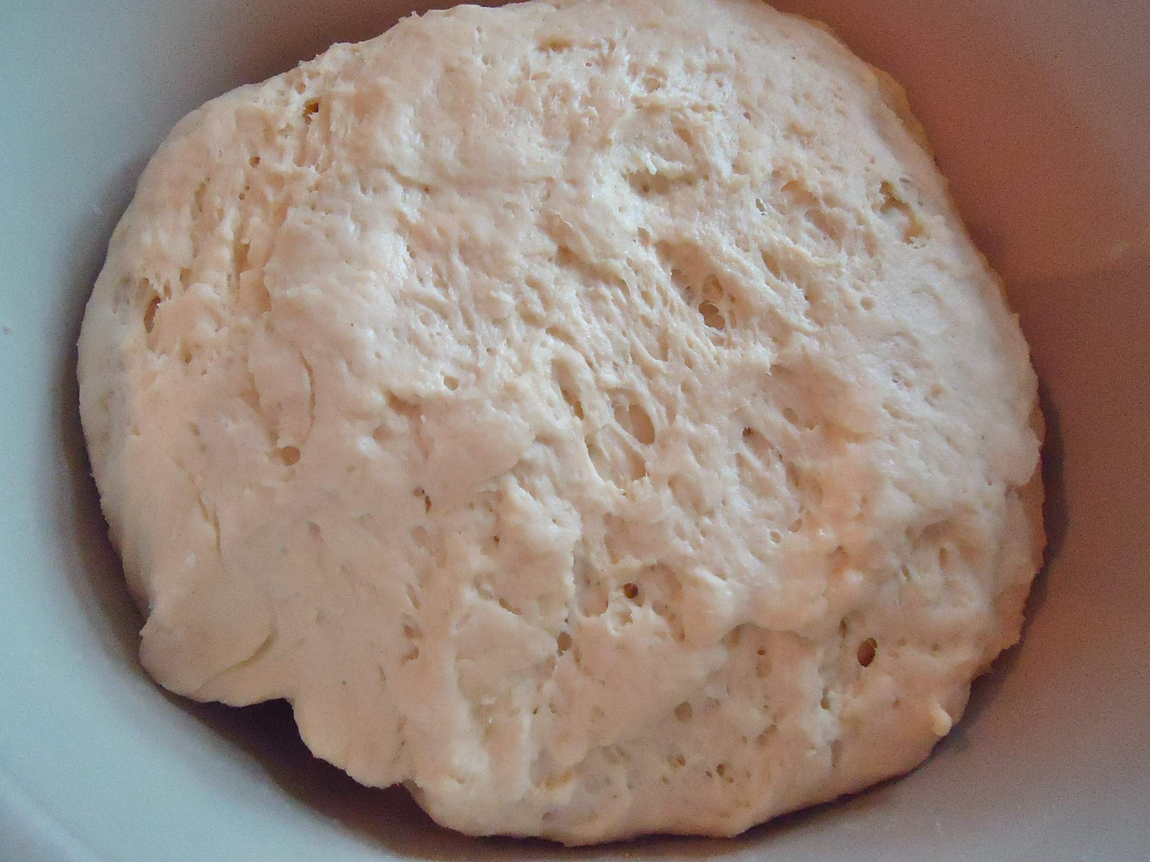 After refrigerating a couple of hours, covered, the dough looks like this. Ready to be rolled into shape! Even in the frig the dough will expand due to all the leavening power.