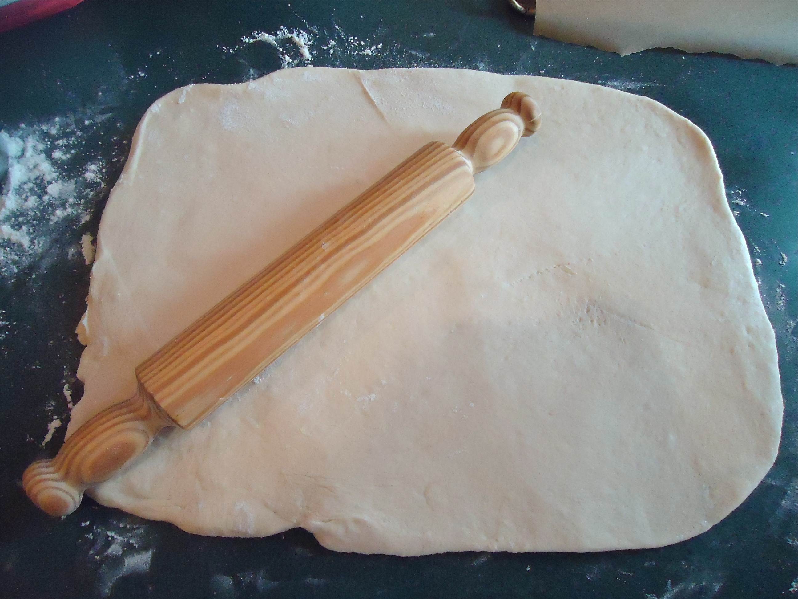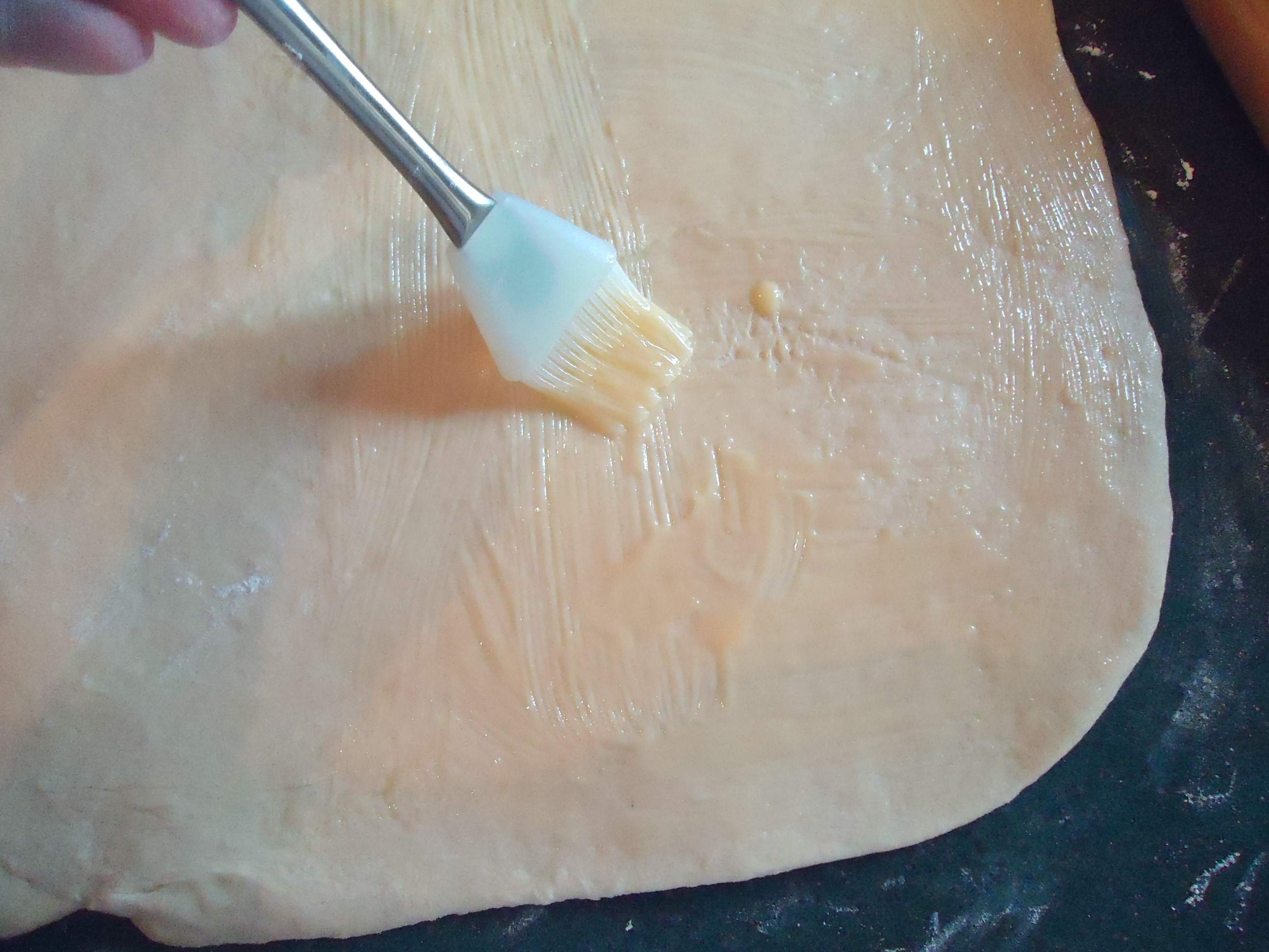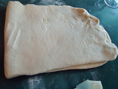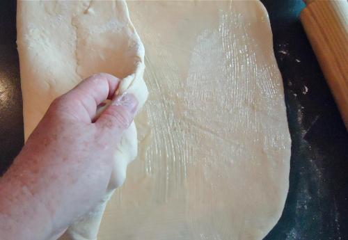 Roll out from the seam. Brush half of the dough with butter again, fold over the dough, and roll out again from the seam.