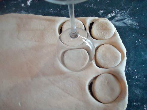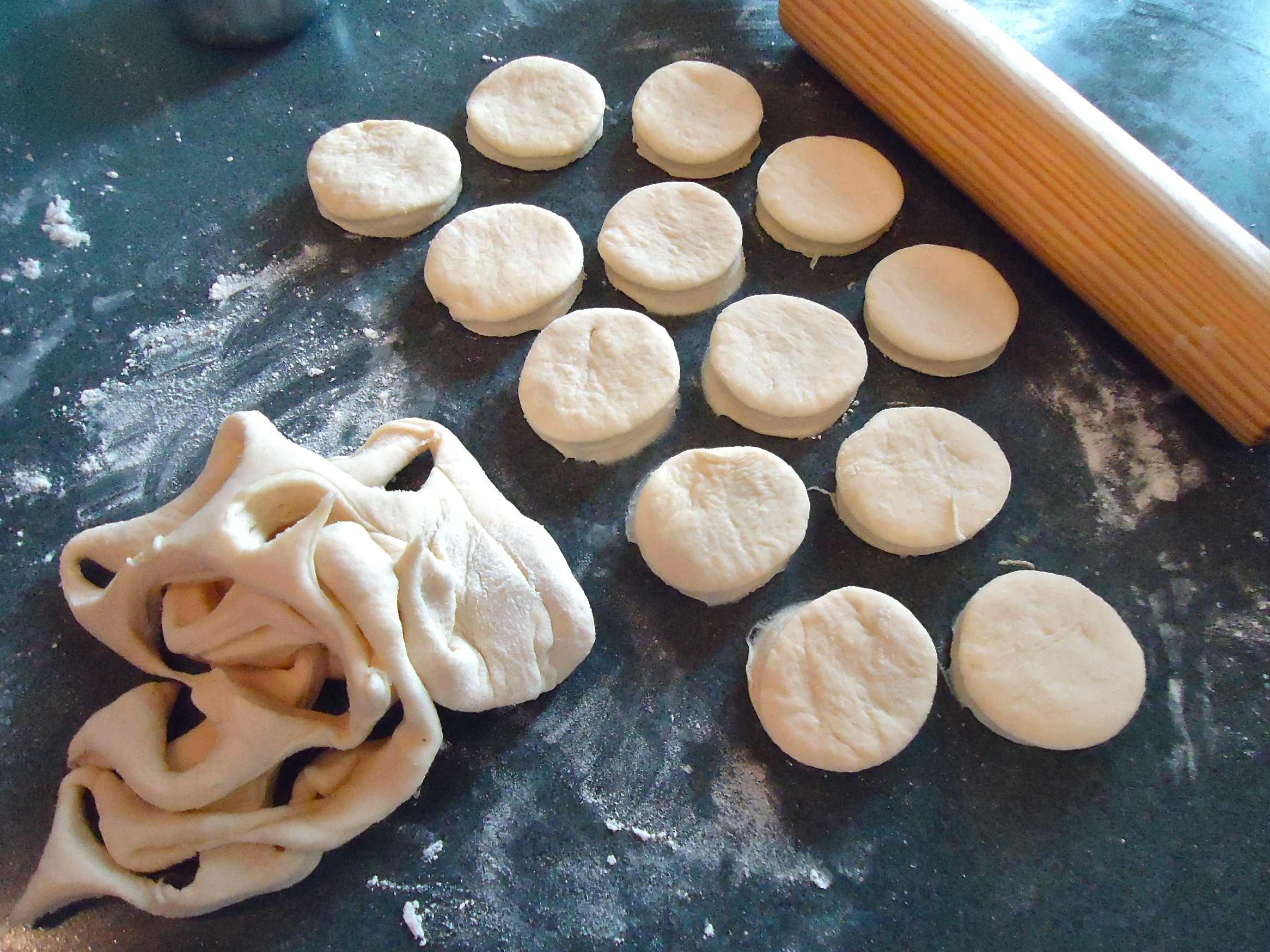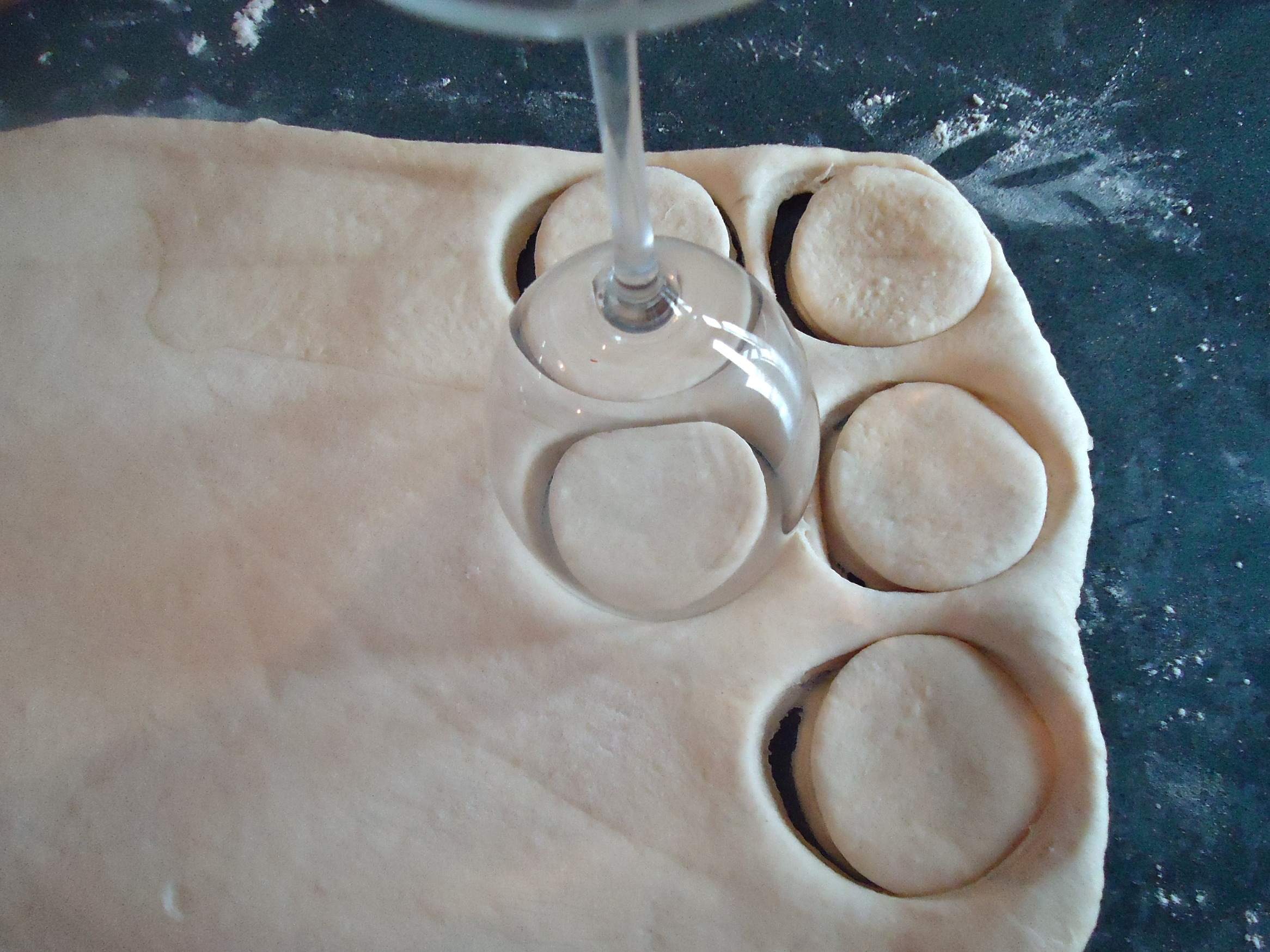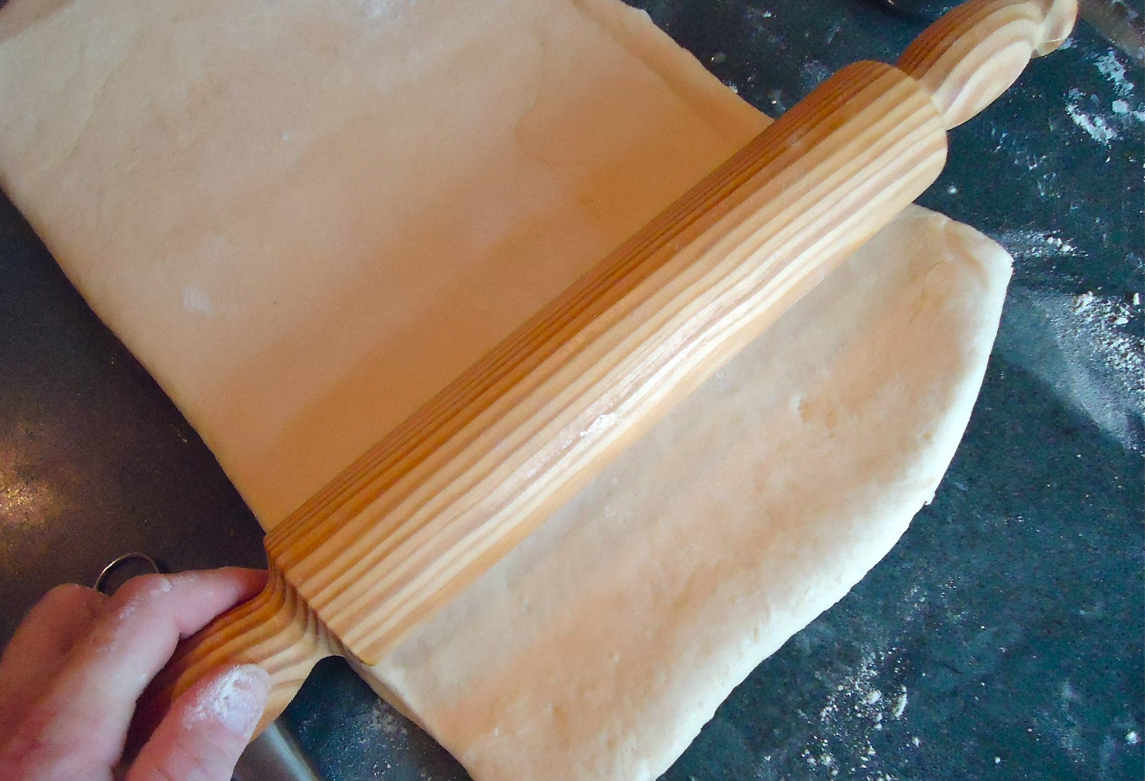 Here is my technique for rolling out dough: Flour the rolling surface and using a rolling pin roll the dough into a large rectangle. Brush one side of the top of the dough and then fold over. Roll lightly back and forth a couple of times, rolling from the solid (seam) side out. Adjust the dough if necessary (turn it 90 degrees) and sprinkle with a little more flour. Roll a couple more times and brush one side with more butter, fold over and roll out one more time. With a biscuit cutter, jelly jar or wine glass dipped in flour, cut your biscuits out. Arrange on a cookie sheet or baking pan lined with parchment paper. Gather up leftover dough and gently form a ball and roll it out again, butter one side of the rectangle, fold over and cut out your biscuits. Continue until you have used all the dough.