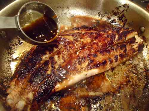 After cooking a couple of minutes, flip the fillet over, pour on the reserved marinade/glaze, cover and cook until the fillet is cooked through. Depending on the thickness of the fillet and the type of fish this can vary. This fillet took a total of about 12 minutes to cook.