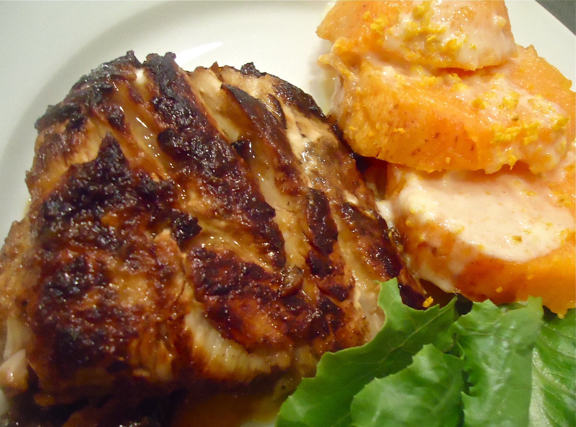 Remove to a warm platter or plate and serve with the gingered sweet potatoes.