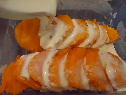 After slicing the potatoes, fan them a bit and sprinkle with 1/4 teaspoon of salt. then pour the ginger cream over top. Cover the baking pan and cook for about 20 minutes.
