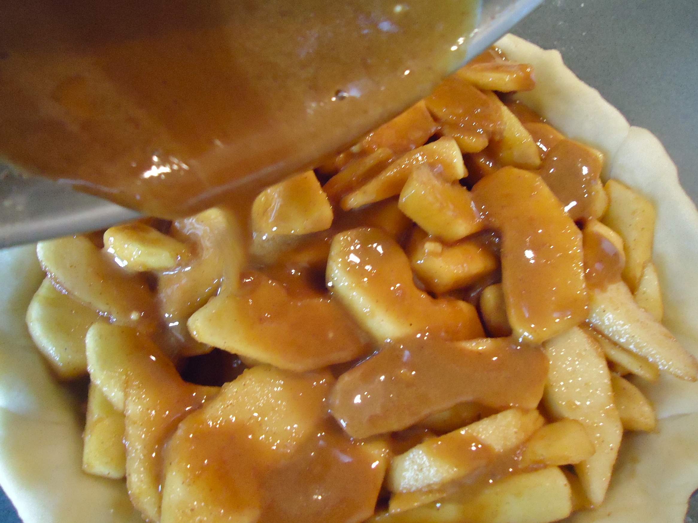 Add the remaining tablespoon of cornstarch*, the flour and the molasses into the ‘syrup’. Stir or whisk. Pour this mixture over the apples evenly. Cover the pie with the top or lattice crust and crimp the edges. If you like, brush the crust with an egg wash.