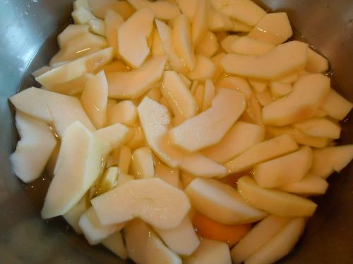 The apples sit for awhile. Feel free to stir them, gently, a couple of times. After awhile you’ll get a sort of syrup in the bottom. This is a good thing!