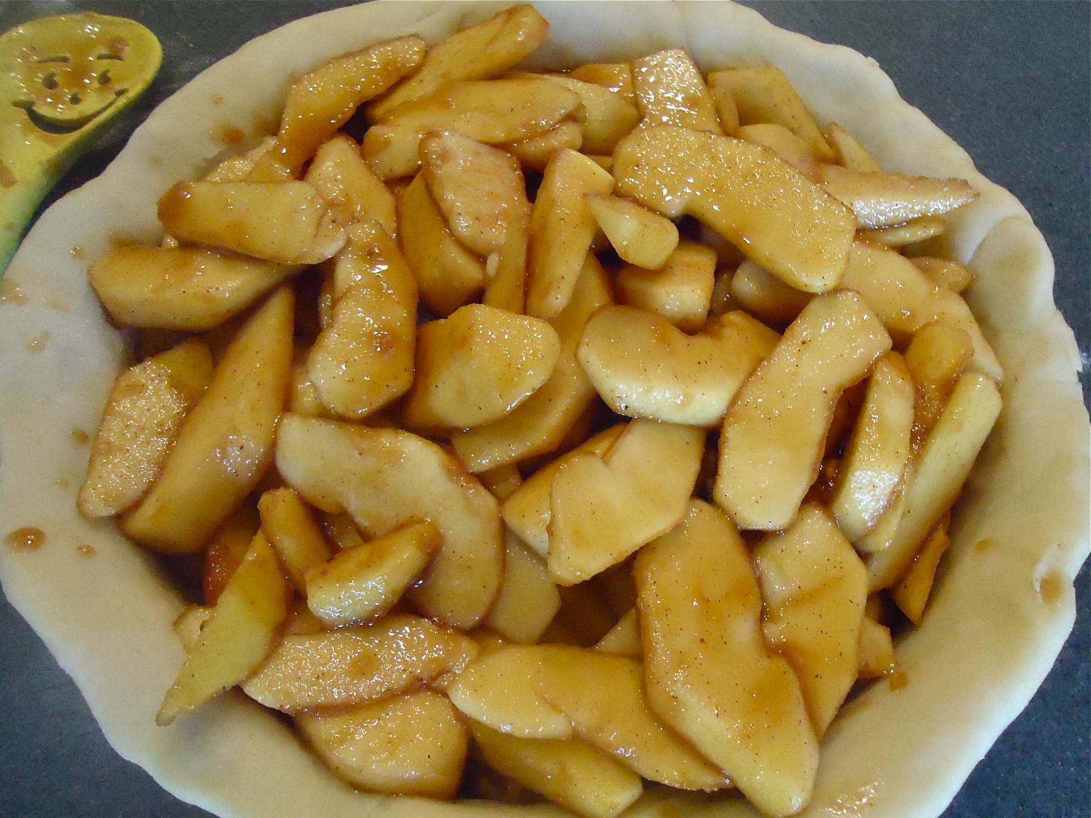 If I have pastry crust to make this is when I make it.  Preheat oven to 425 degrees ahrenheit . After the allotted time, stir the apples and see that the juice from the apples and the sugar mixture has created a ‘syrup’. Stir the apples again and spoon them, but not the ‘syrup’, into the prepared pie crust.
