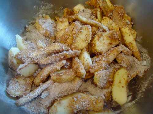 In a small bowl mix the sugars, spices, 2 tbl. cornstarch and salt. Pour the drained apple slices back into the large bowl and sprinkle the sugar/cornstarch mixture over them, stir gently to coat. Allow the apples to sit at room temperature at least 30 minutes and up to an hour.