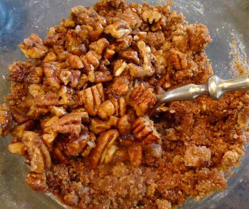 In a skillet melt 1 tbl. brown sugar and whisk in 2 tbl. water. When sugar is dissolved add in the pecans. Stir, turn up the heat slightly and add in the rum. Cook on medium heat about 1 minute or so. Keep stirring, do not allow to burn. Remove from heat and set aside while making the streusal. In a medium bowl mix all other streusal ingredients, adding in pecan mixture last. Set aside.
