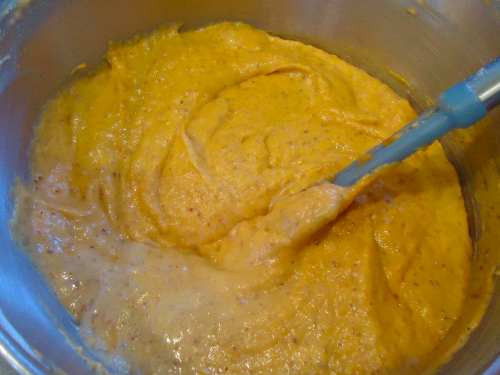 Preheat oven to 375 degrees. Sift the flour and then measure. Mix the flour, flax, spices, salt and baking powder together. Set aside. In a large mixing bowl beat the oil and sugar then add the eggs in one at a time, beating well after each. Add in the flour mixture and then the pumpkin.