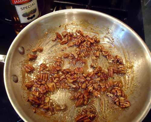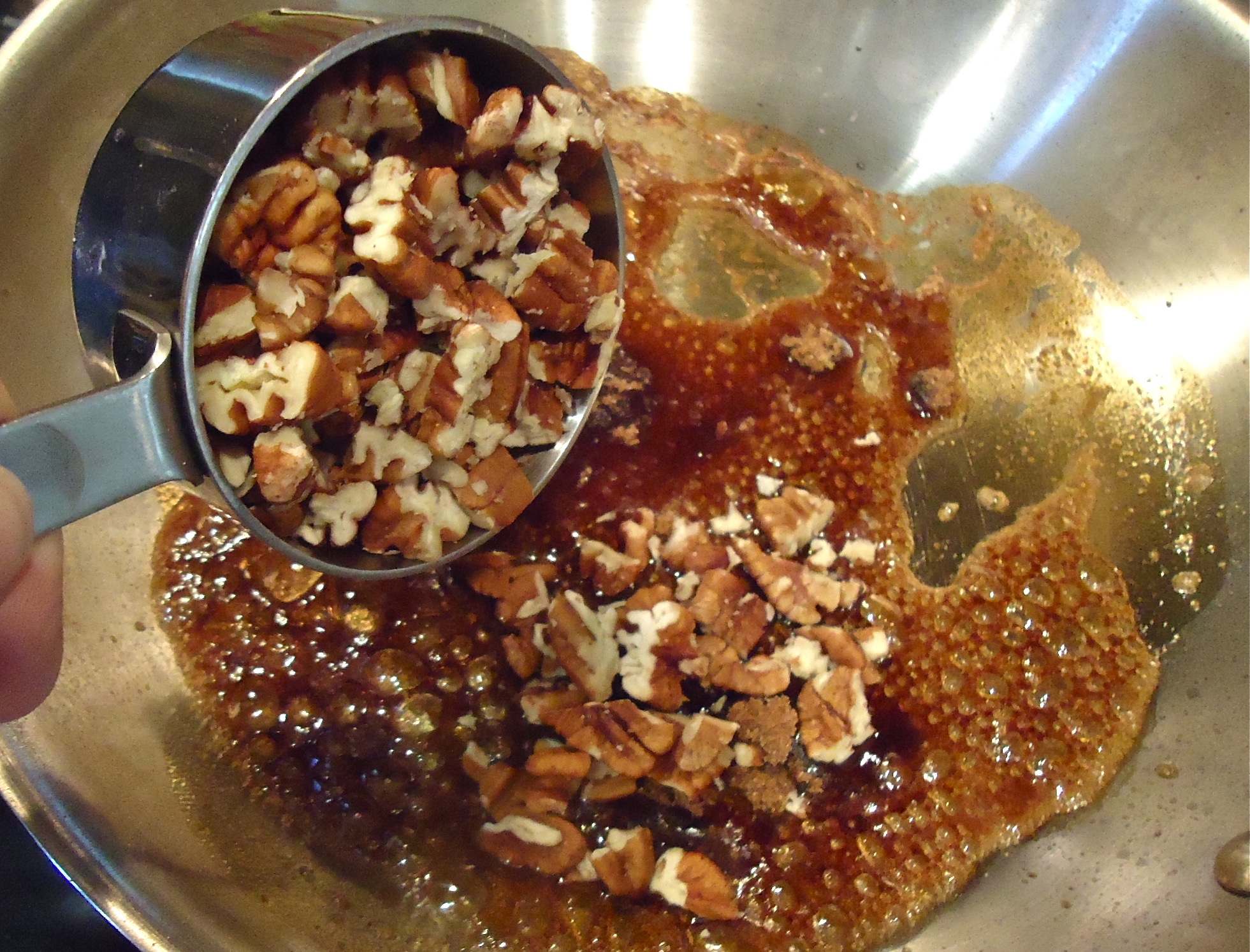 Add in the ‘revved’ up pecans, stir and set aside while you make the pumpkin cake batter.