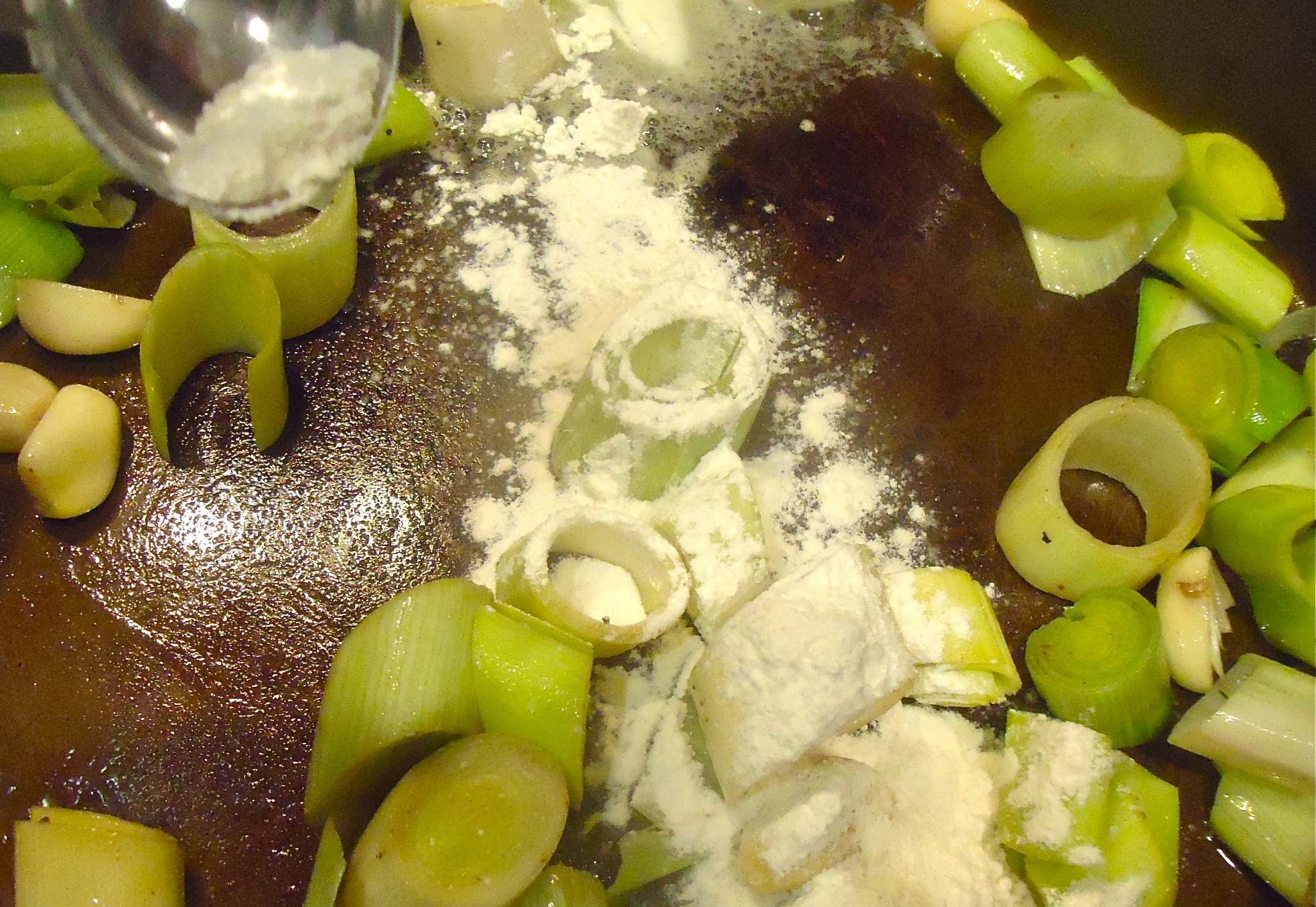 saute leeks and add flour Published December 3, 2012 at 1965 × 1355 in Down home goodness with braised chicken with leeks ← Previous Next → After browning the chicken and removing it to a hlding plate or platter, wipe out the Dutch oven. Then melt the butter in the pan and add the leeks and the whole garlic cloves. Sprinkle with flour. Betsy Hinderliter, South by Southeast