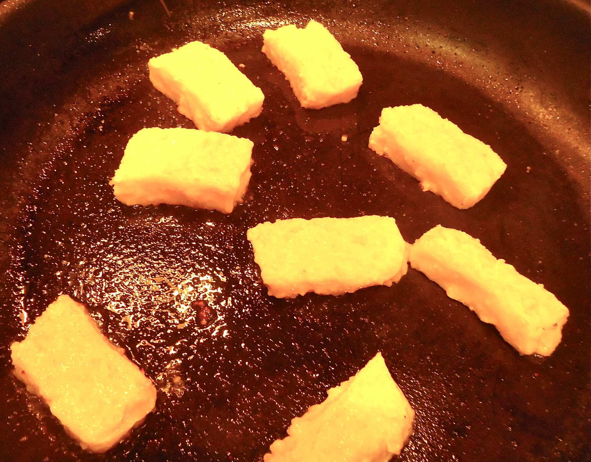 Brown the grits slices in bacon grease (or butter or a high heat oil like grape oil). However use a NONSTICK pan. Believe me, you’ll be glad you did. Also clear away children from the immediate cooking area and use a splatter screen!
