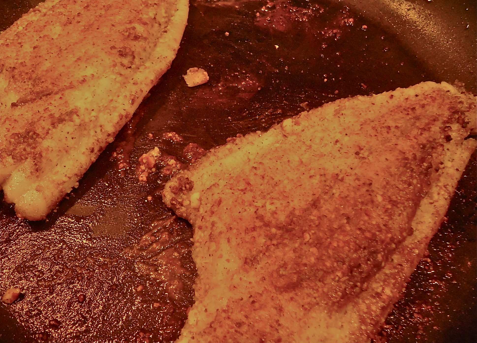 Now flounder (similar to sole and turbot) is a delicate fish, perfect for a hot pan sauté. And as I am proud that my 5-year-old loves salmon, a rather oily, very “fishy” fish, I can count on her liking flounder too, so I was satisfied it would fit into my dinner plan. The fillets at the market were just the right size, reasonably priced and as I noted above, locally caught. My version of a French classic: Prepared Southern-style with flounder and pecans!