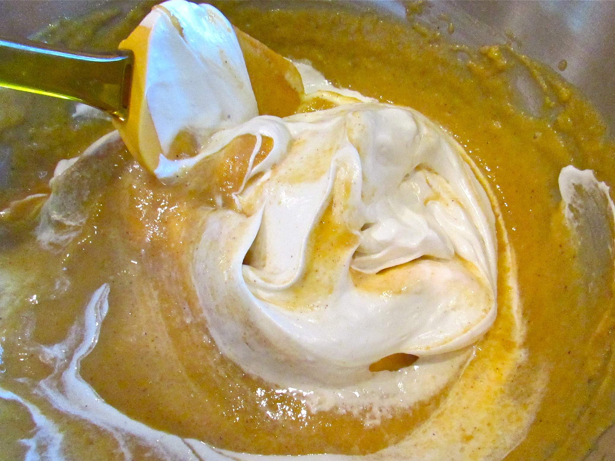Whip the egg whites with the sugar until stiff and then fold into the squash mixture. Yes, this recipe uses raw egg whites so if your immunity is compromised or you do not feel comfortable about using raw egg whites, please refrain from making this recipe.