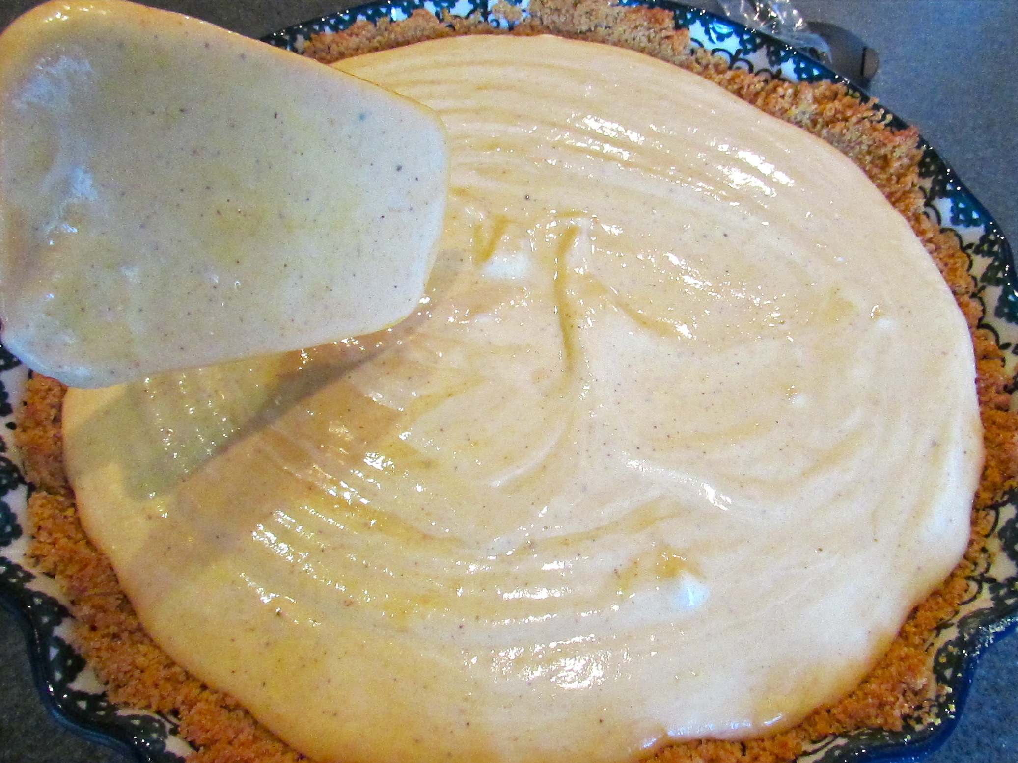 After setting up in the frig for a bit (1 hour at least) the pie should slice beautifully. I add some lightly sweetened whipped cream and grated nutmeg. Just like heaven!