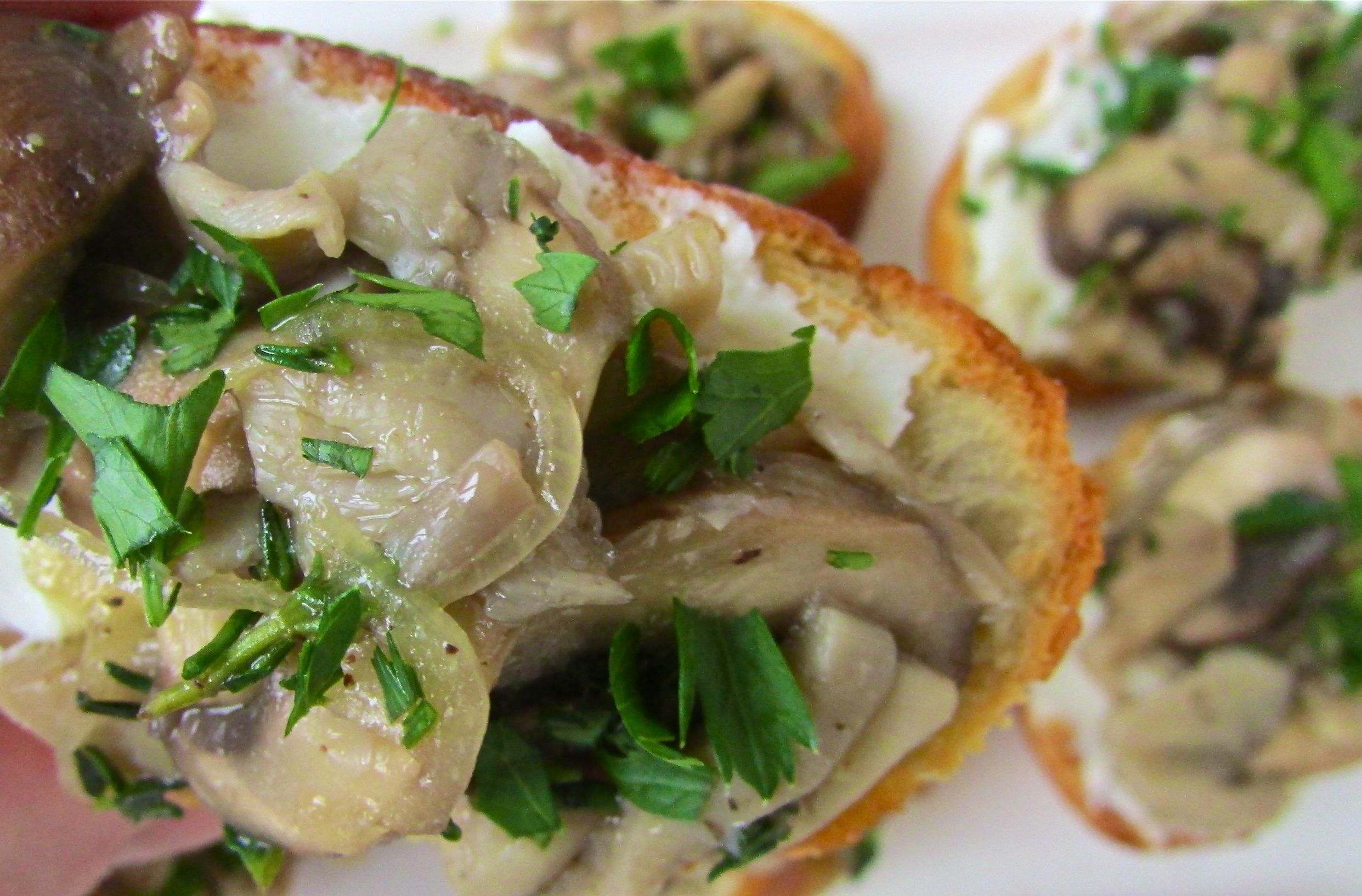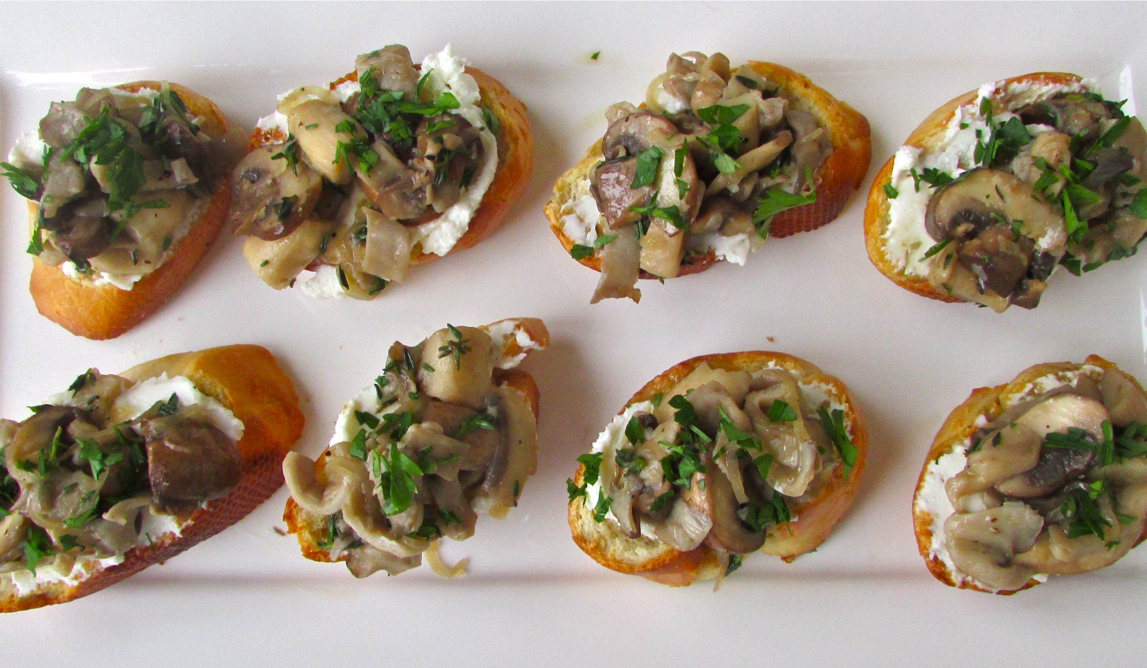 Put the toasts together – slather a good layer of the goat cheese on toasted French bread slices, top with the warm mushroom mixture and sprinkle with parsley.