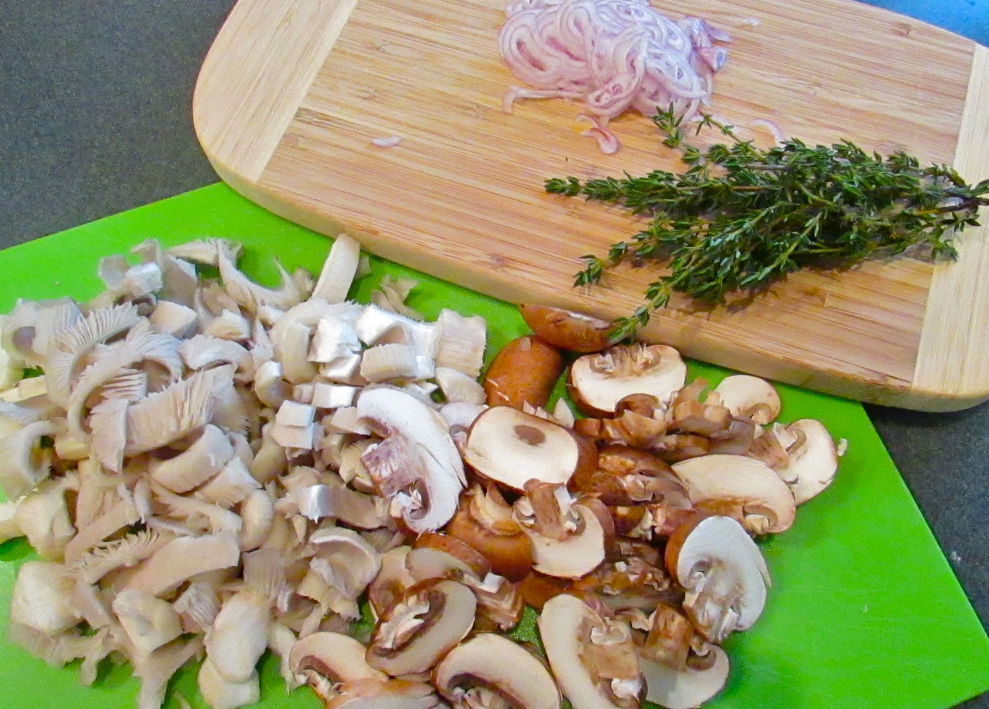 The prepared mushrooms – both the oyster mushrooms I grew and some purchased portobellos -Chef Pawlcyn uses morels but a combination of different mushrooms will work great.