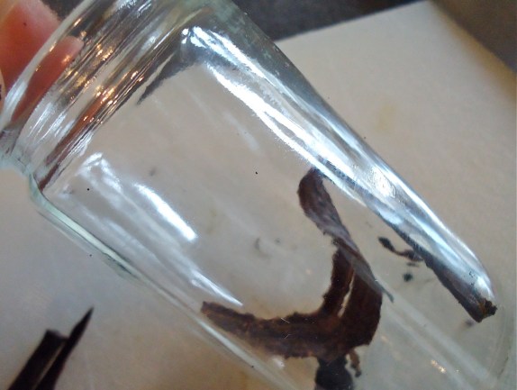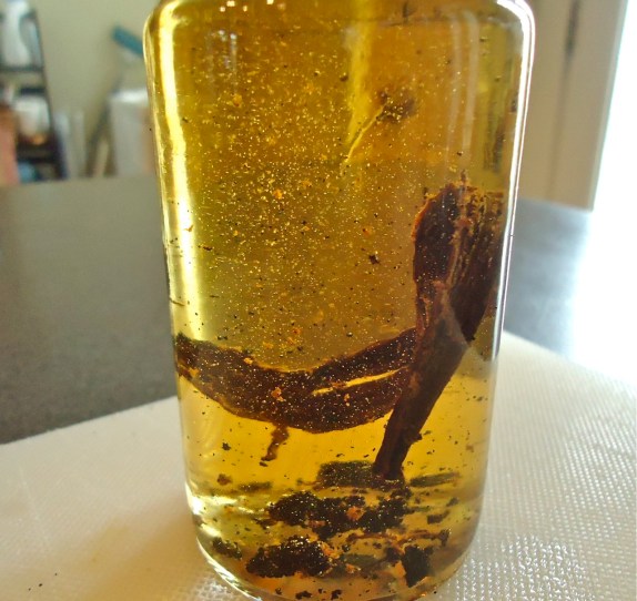 I use a smallish glass jar (4 oz., ½ cup size) with one bean. Simply split open the bean, scrape out the insides (these are seeds) and add to the jar. I throw in the leftover bean “skin” too. Then fill the bottle with rum, seal the lid tight and give it a good shake. Allow to sit and soak for at least 24 hours. Anytime I walk by it within that first 24 hours I’ll give it a little shake. Then use at will – ‘cause you’ve got extract people!